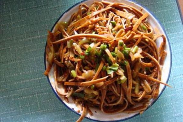 做法:把牛皮豆干洗净用开水烫过。豆干切丝、蒜姜切末、葱香菜切小段。豆干捞出沥水摆盘。所有调料兑成料汁。淋上拌均即可