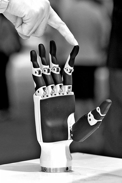 一名参观者在北京中关村国家自主创新示范区展示中心触摸一只仿人五指灵巧手。