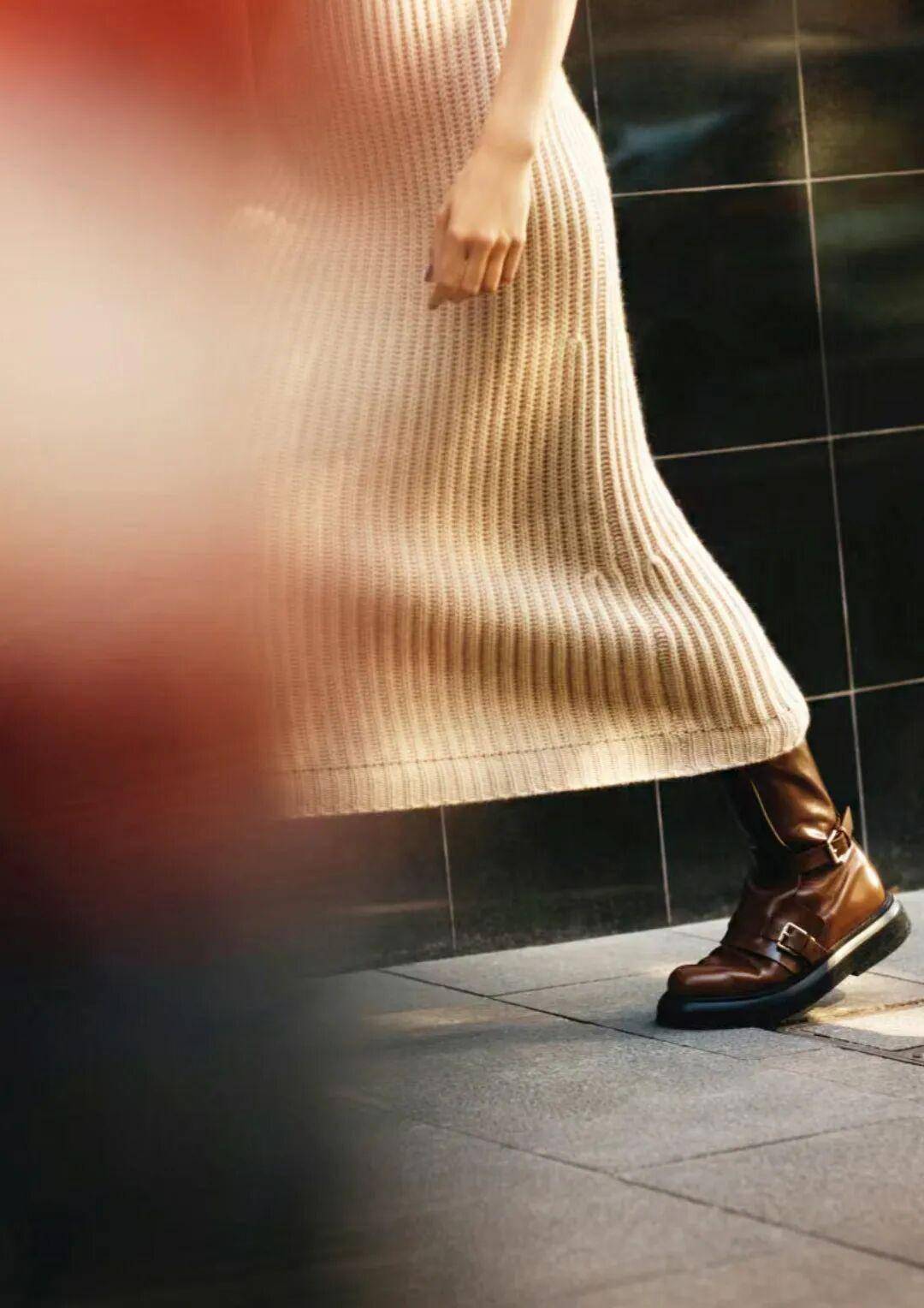 通勤穿:选深咖色修身针织裙及膝,外搭米白色长款呢子大衣,系一条同色系围巾,配切尔西靴,大衣敞开穿,露出针织裙的利落线条,文艺又显干练,开会、见客户都得体;