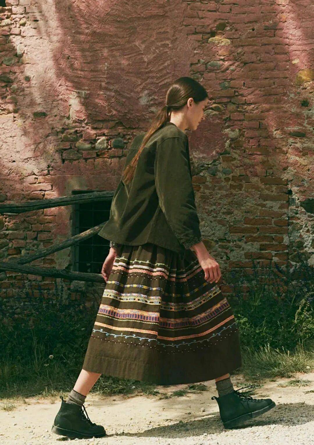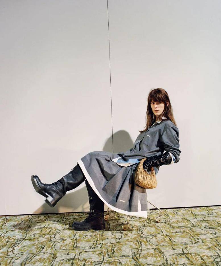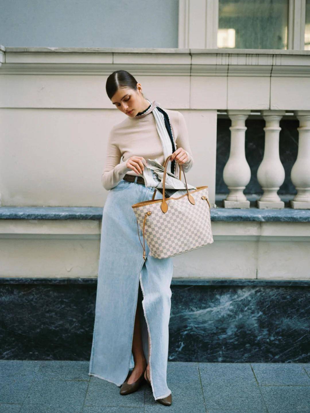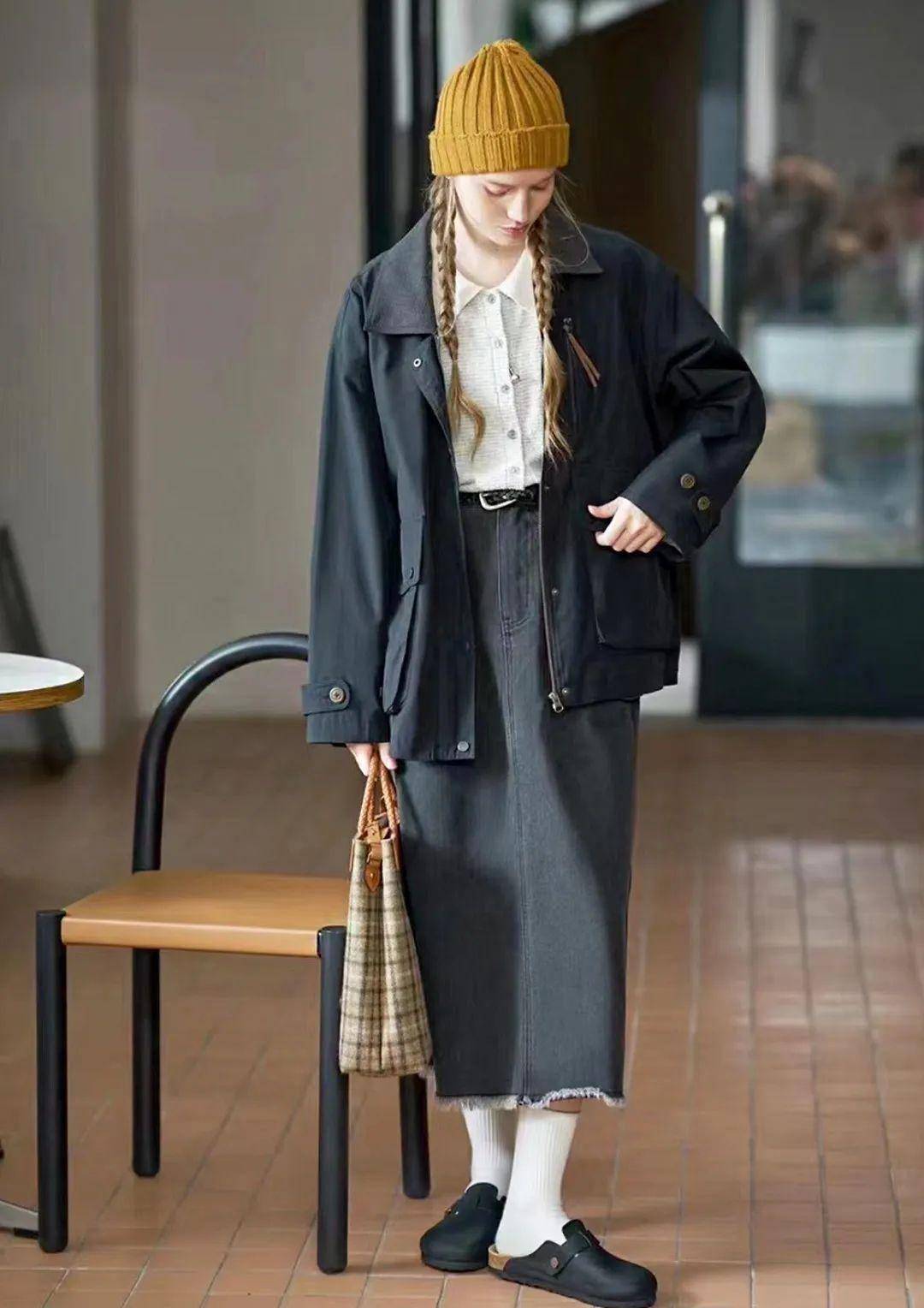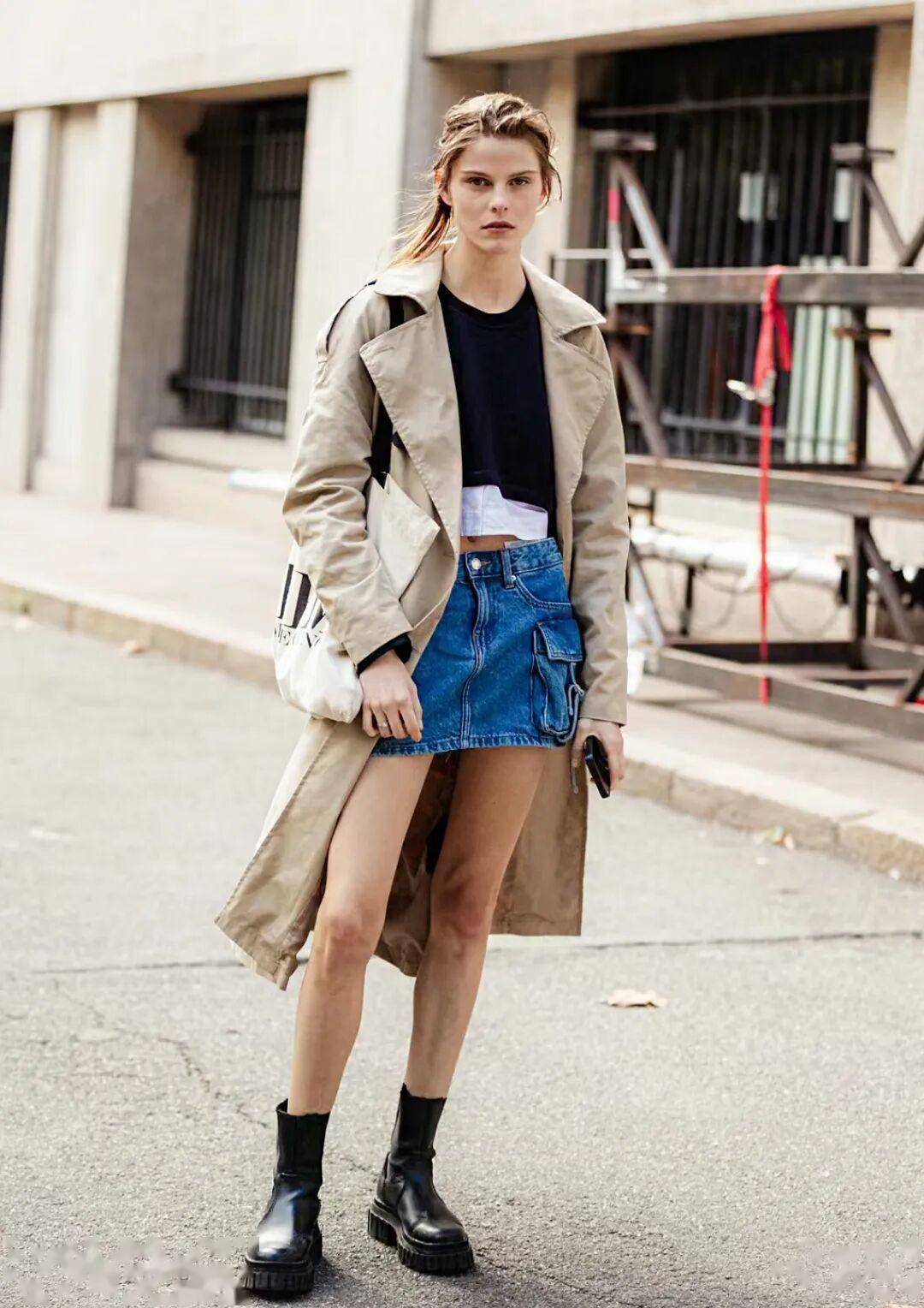 牛仔叠穿风:深蓝色直筒牛仔半裙过膝,内搭同色系牛仔衬衫解开当外套,内搭白色 T 恤,配棕色马丁靴,牛仔的硬朗被裙装弱化,不显锋利,街头感十足,适合音乐节、潮牌店逛街;