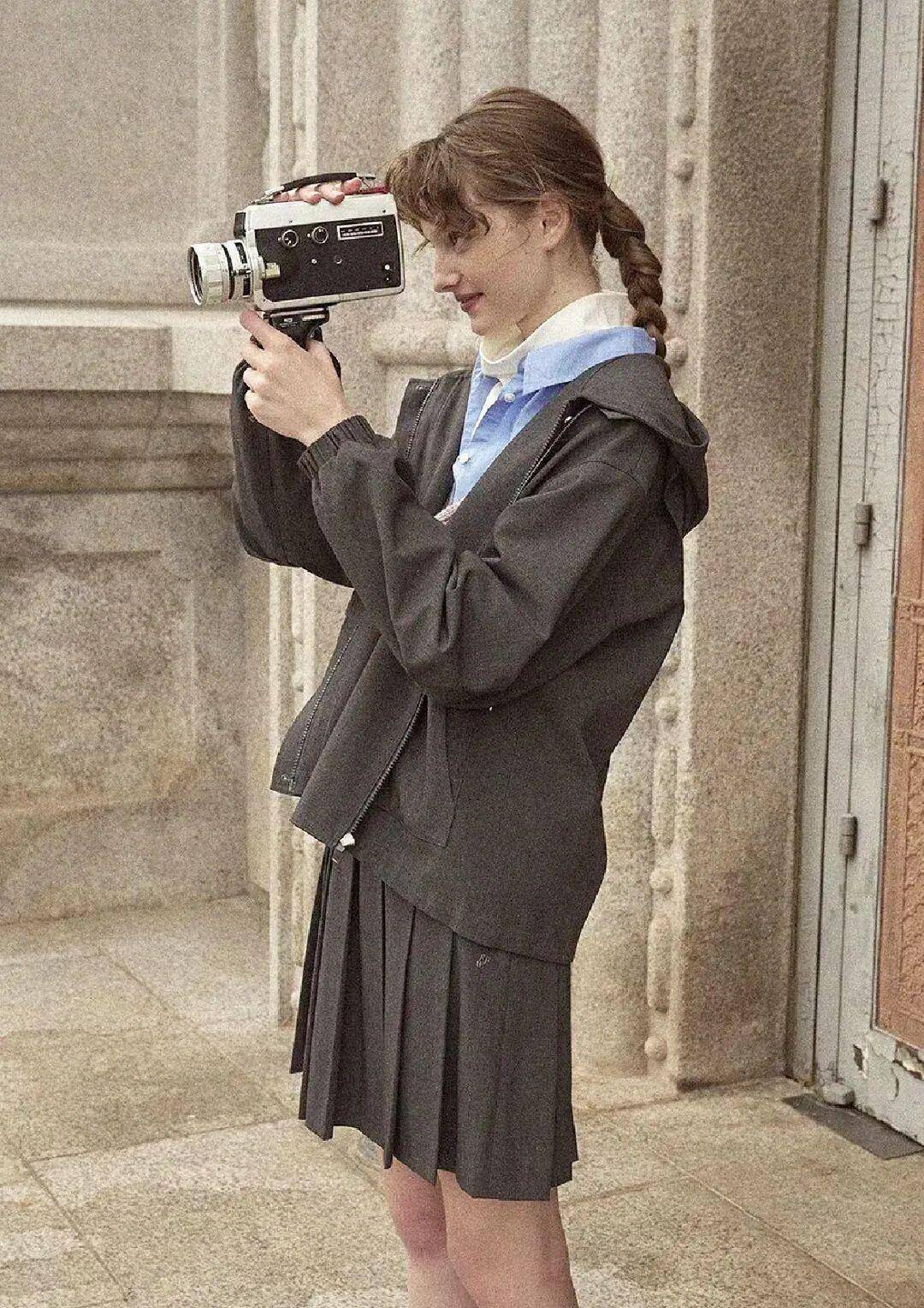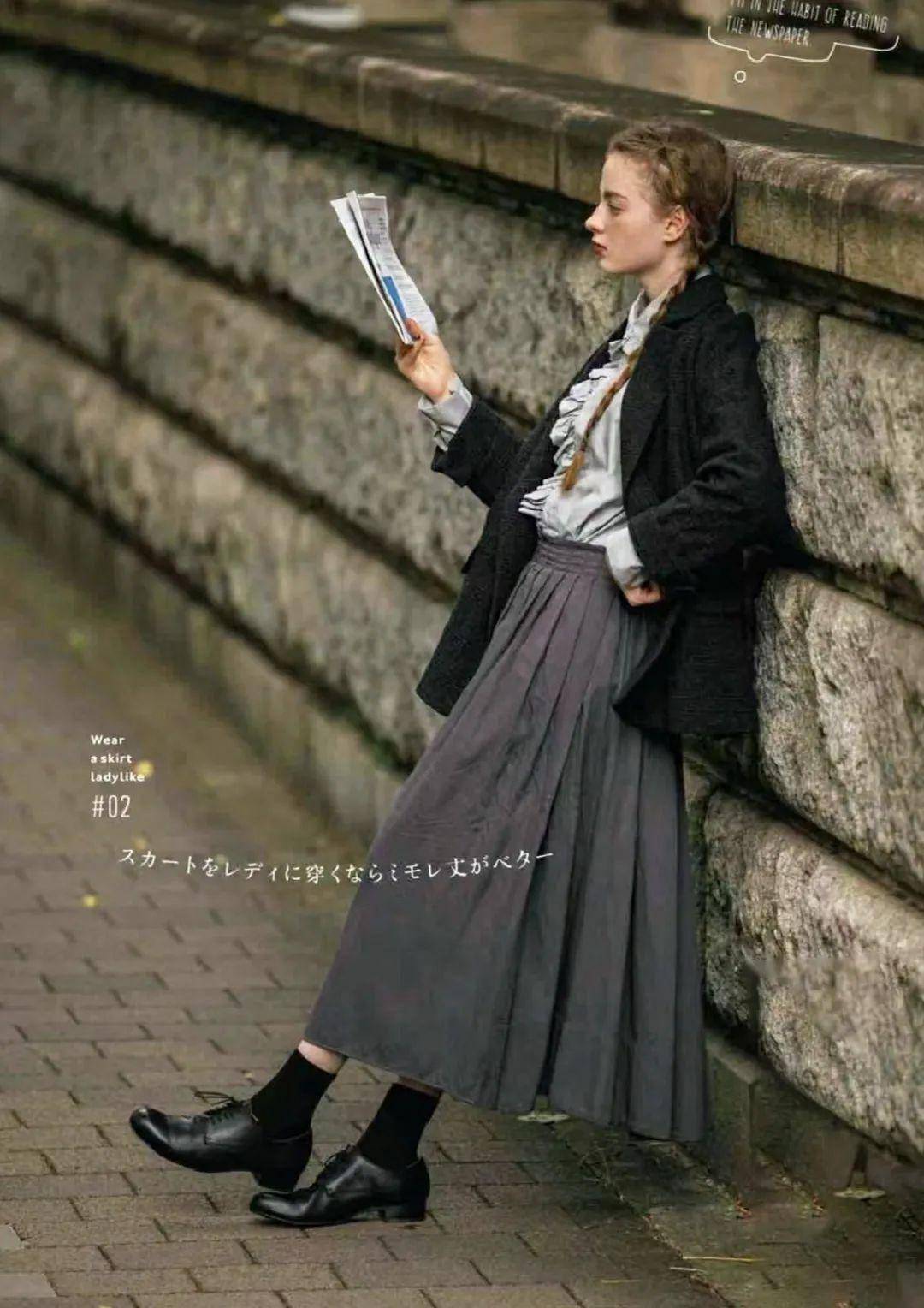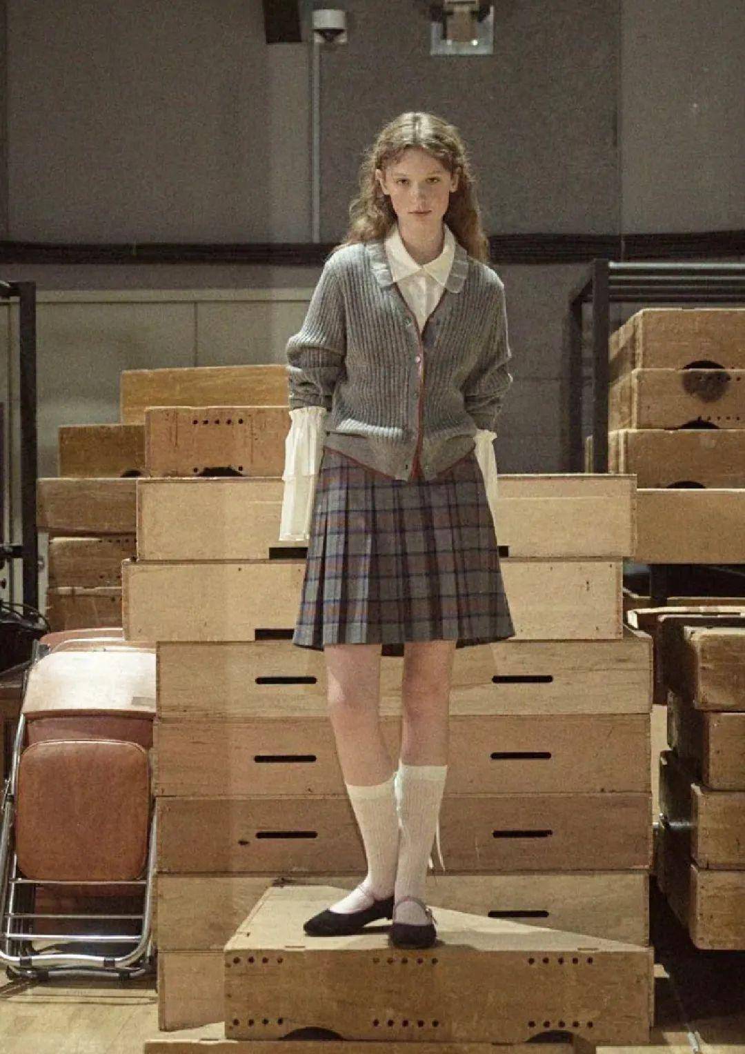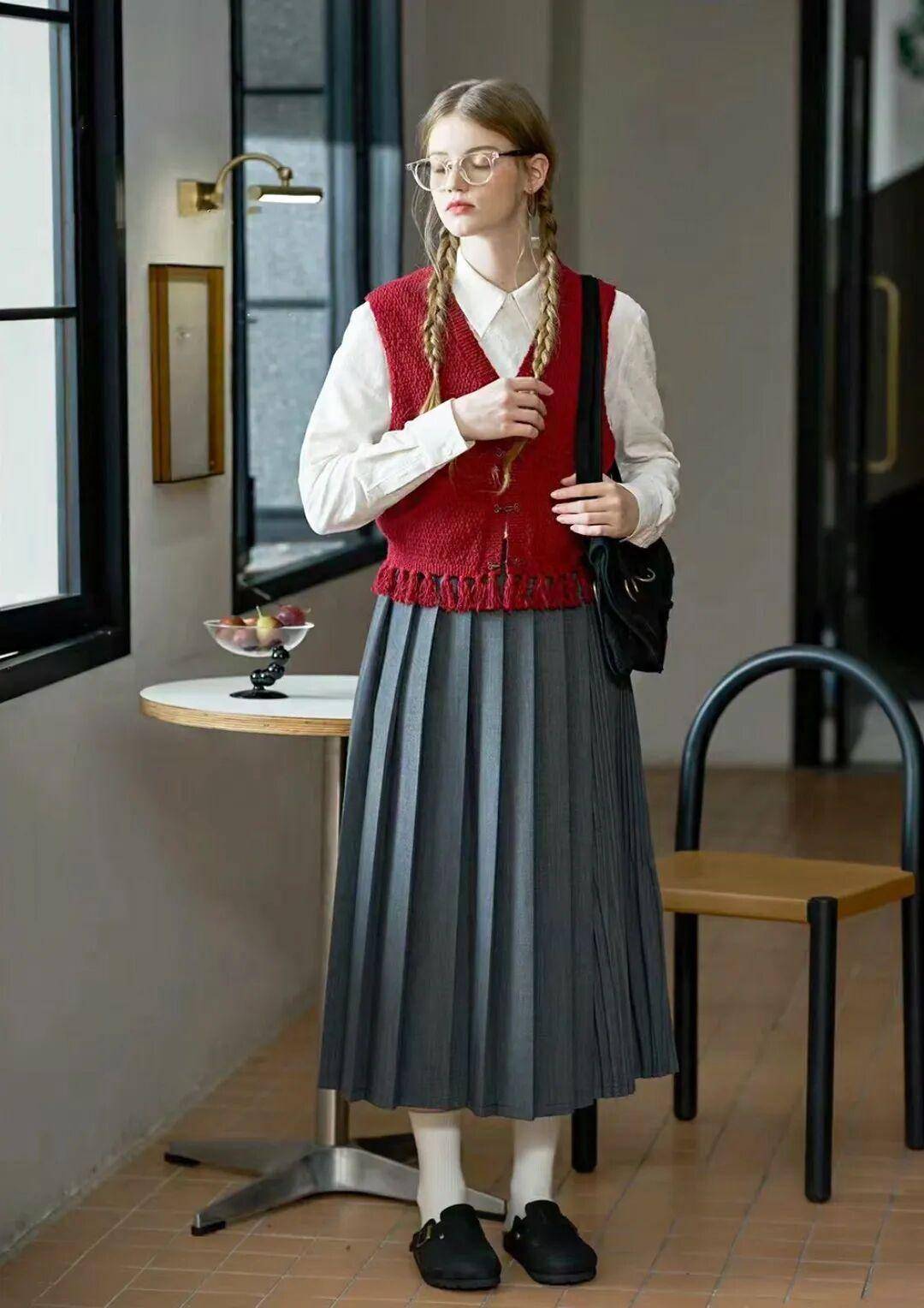 学院风:灰色格纹短款压褶裙,内搭白色衬衫,外披藏蓝色针织马甲,配黑色乐福鞋、中筒袜,衬衫领口系领结,像 “刚下课的学生”,周末去图书馆、买文具都合适;