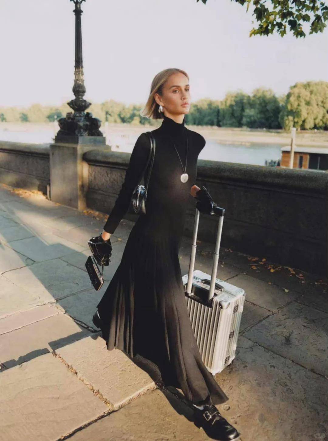 约会穿:黑色修身针织裙及大腿中部,外披短款黑色皮衣,配黑色短靴,皮衣的酷飒中和针织的柔,甜酷平衡,夜晚约会时,灯光下针织裙的质感更显高级。