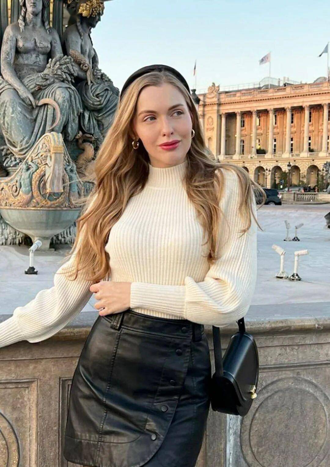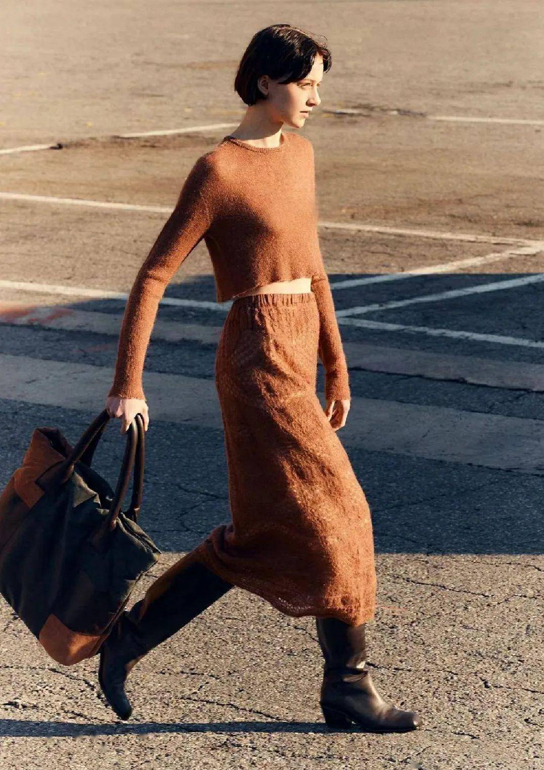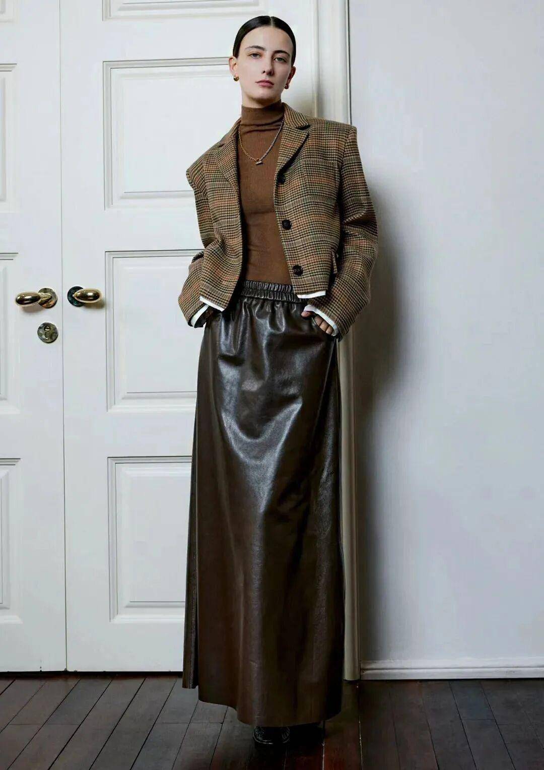 日常穿:棕色 A 字皮裙过膝,内搭米色短款针织衫,针织衫塞进 1/3 裙腰,配白色帆布鞋,皮裙的质感撞针织的软,随性却不随意,逛市集、朋友小聚都合适;