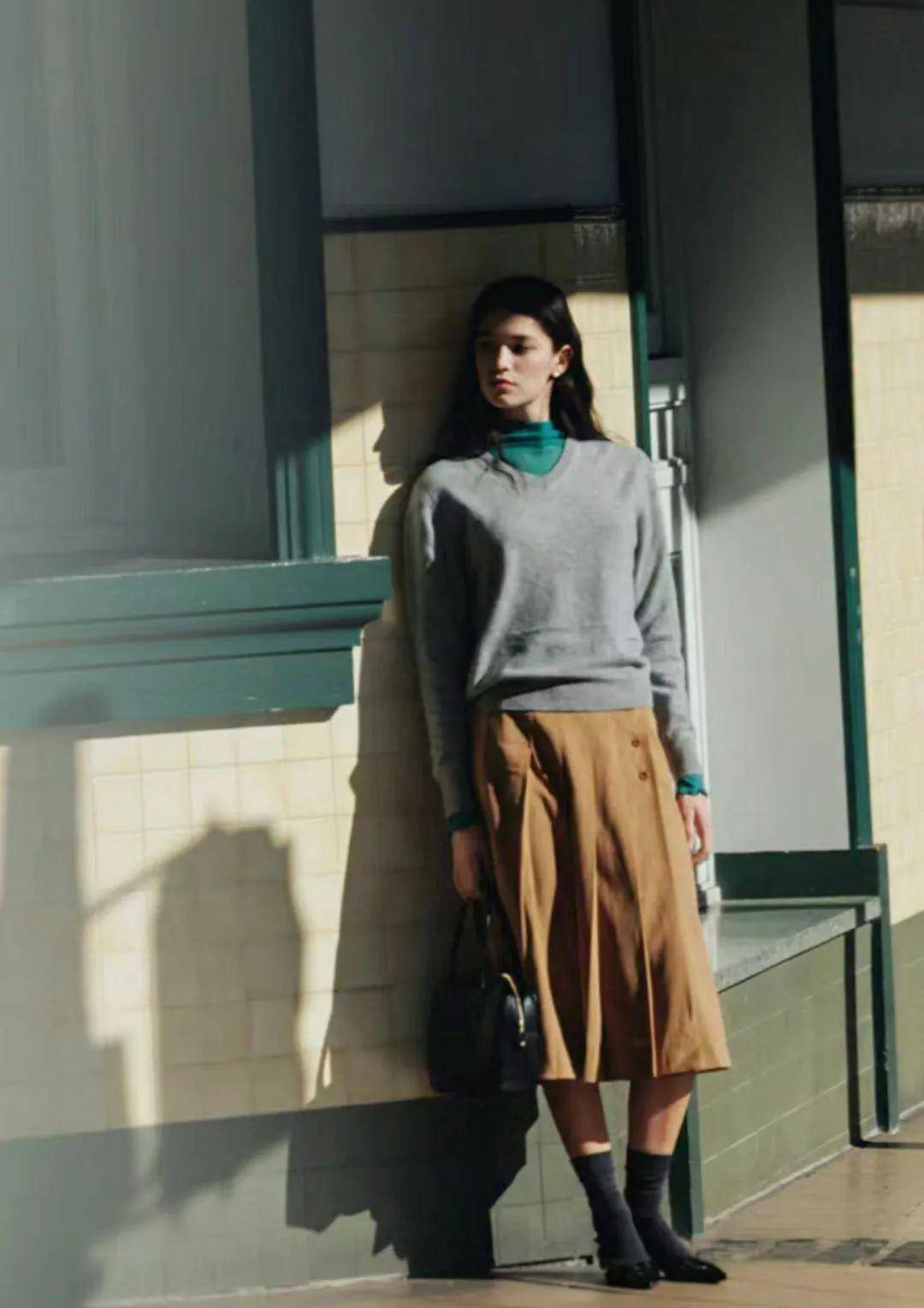 日常穿:浅灰色宽松针织裙过膝,内搭白色高领打底,配棕色乐福鞋,裙摆自然垂落,逛咖啡馆、遛弯都舒服,像 “裹着暖毛毯的秋日午后”;