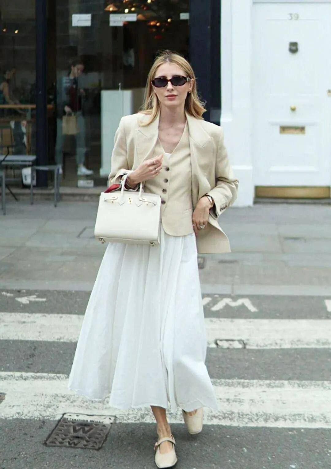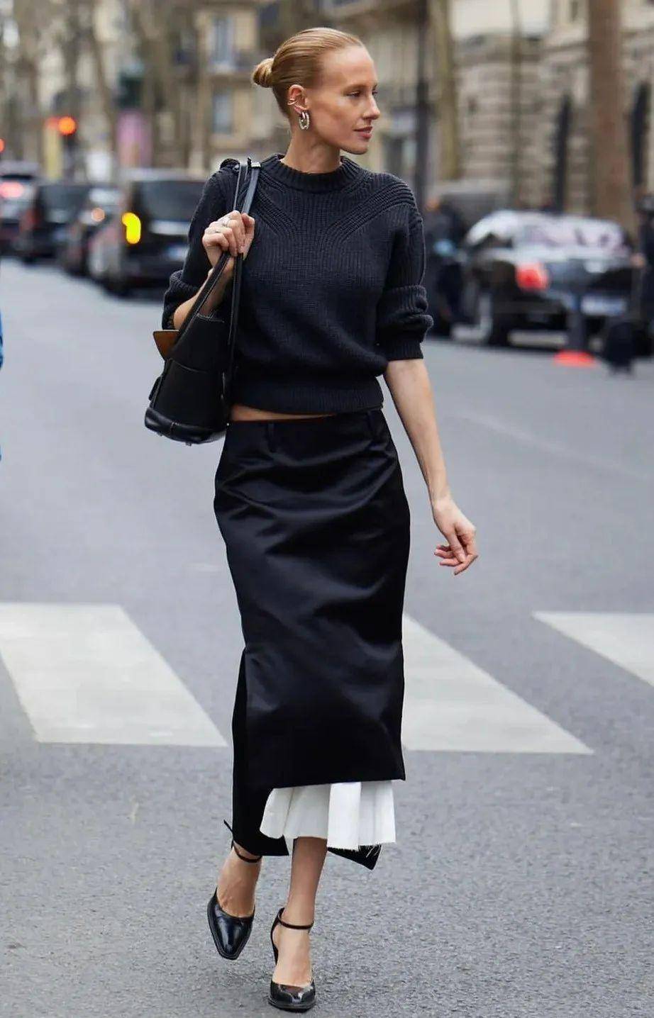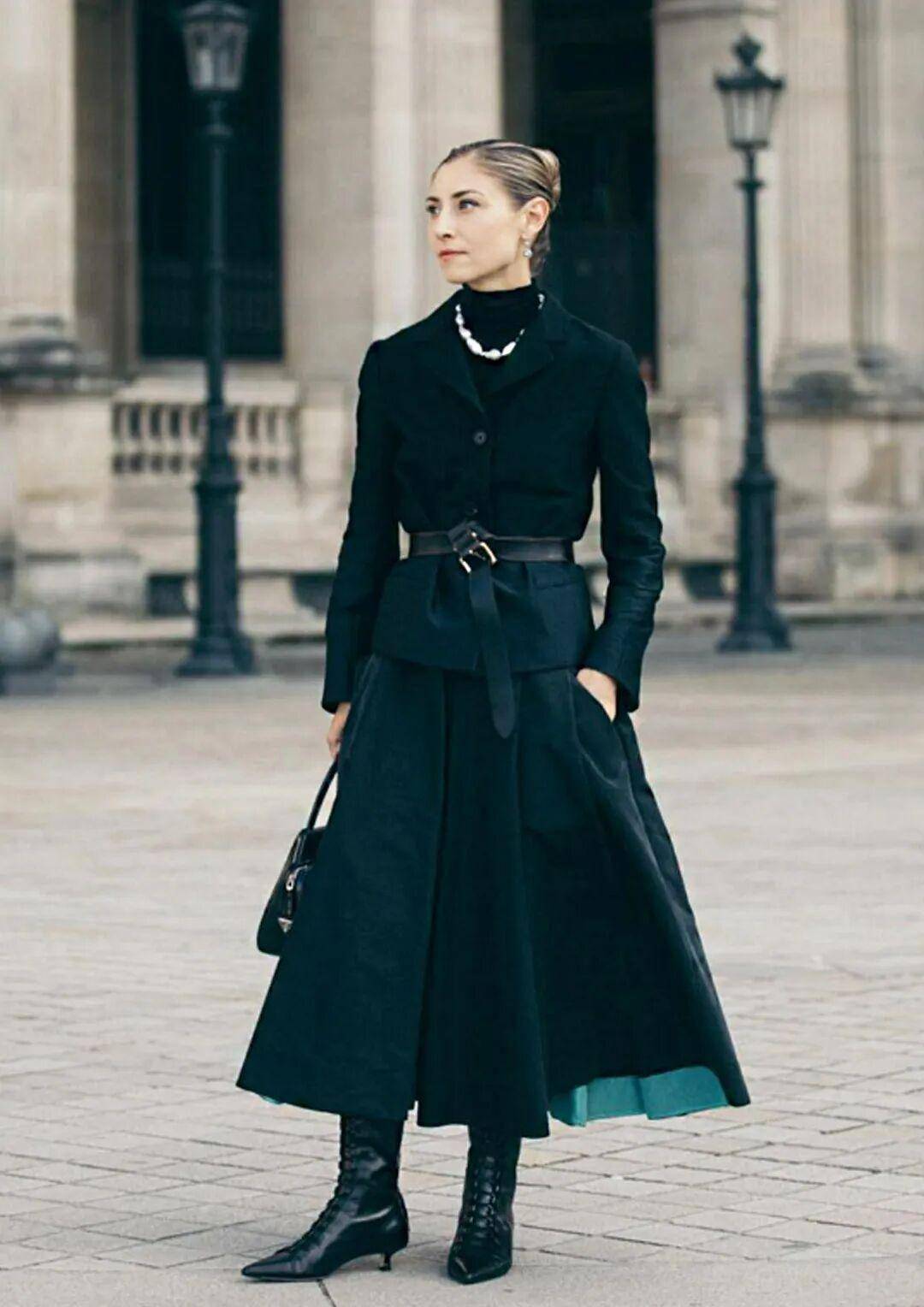 千金玛德琳风:黑色伞裙及膝,内搭白色衬衫,外披短款黑色西装,配黑色乐福鞋,衬衫领口系蝴蝶结,戴珍珠项链,精致又松弛,参加生日宴、轻社交活动超吸睛;
