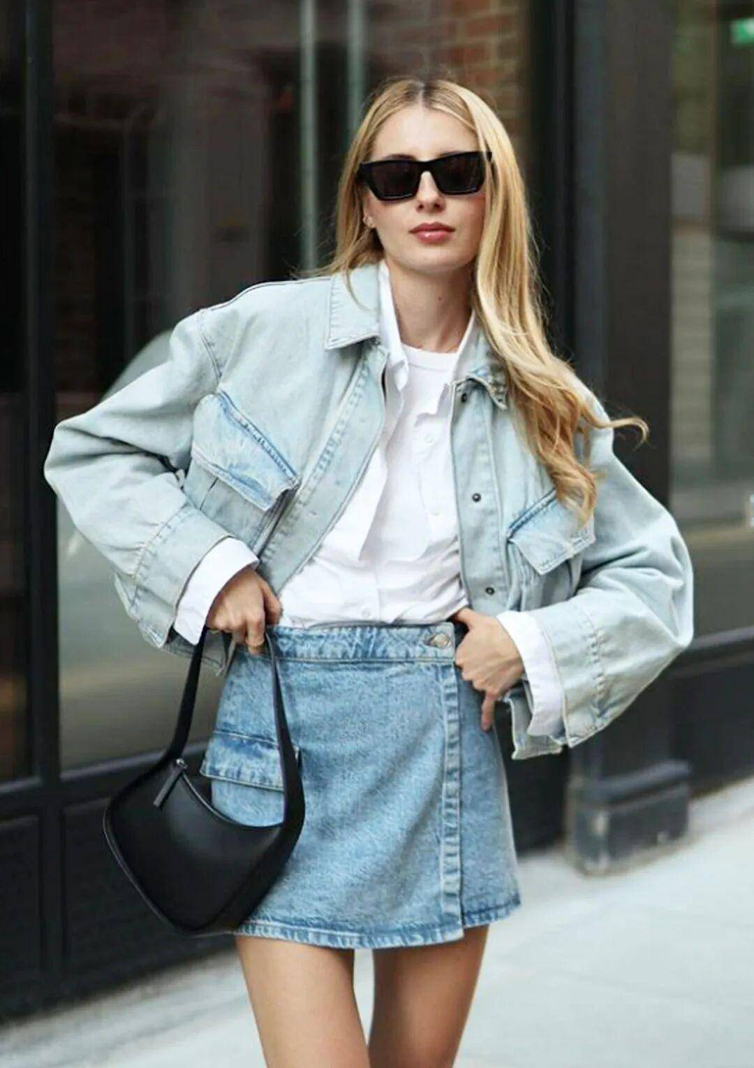 职场混搭风:黑色牛仔半裙及膝,内搭白色衬衫,外披浅灰色西装,衬衫塞进裙腰,配黑色乐福鞋,西装的正式被牛仔裙的休闲稀释,通勤穿不呆板,午休去买咖啡也显活力。