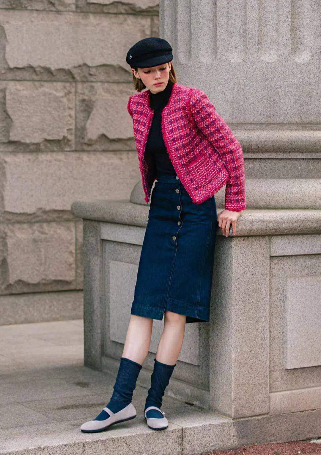 牛仔半裙是秋冬的 “复古担当”—— 借着复古风潮重回时尚圈,既能搭卫衣穿出休闲感,也能配西装中和正式感,像 “把 90 年代的街头风穿在身上”,随性又时髦。