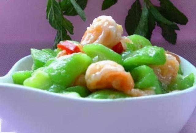 3.放丝瓜翻炒2分钟,途中加一点热水使丝瓜保持水润至熟,加盐后再倒入虾仁,放味精,淋上水淀粉勾芡即可。