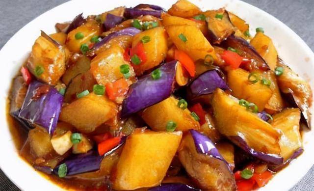 做法1、土豆、紫茄子切滚刀块,葱切断,姜切条、青椒切块。将土豆在开水中煮几分钟,控干水。起油锅,油热后依次放入土豆、茄子炸熟,捞出备用。