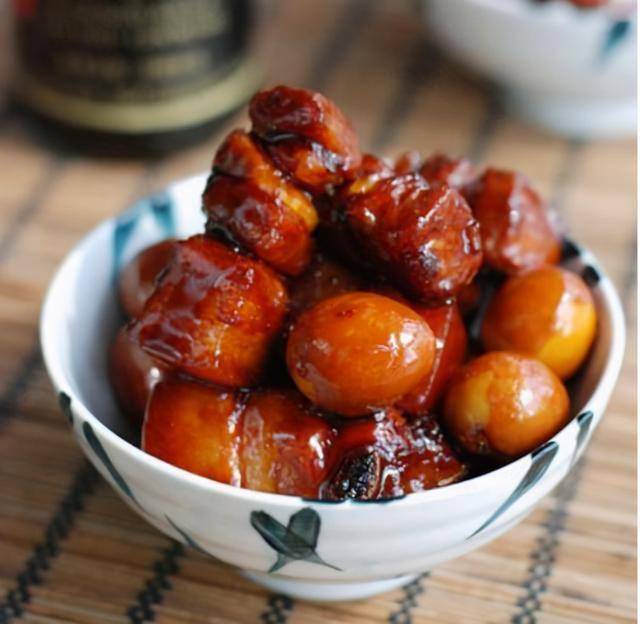 食材:五花肉、鹌鹑蛋、姜片、桂皮、八角、酱油、冰糖、绍酒