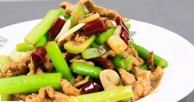 5、翻炒出香味以后,加入老抽2克,提一下底色,倒入芹菜继续翻炒均匀,如果太干,加入少许清水。