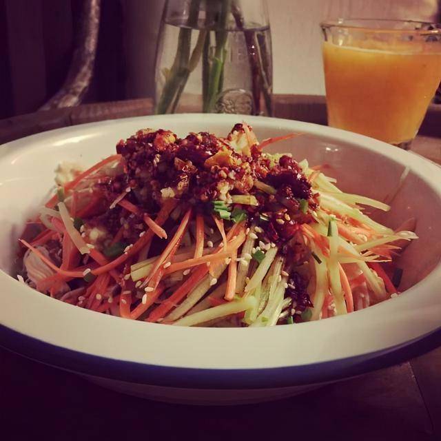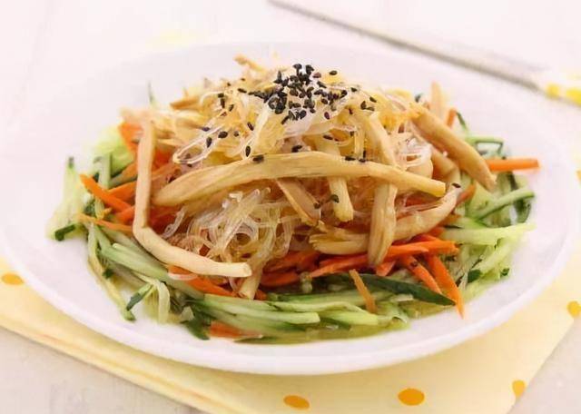 4.煮熟的黑木耳、胡萝卜和黄瓜分别切成细丝,将材料混合,倒入调味汁即可;