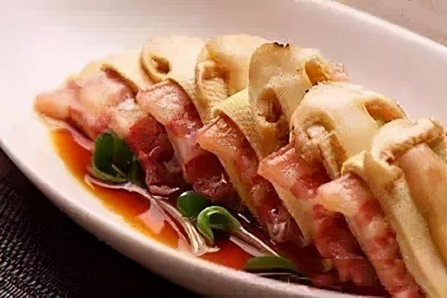 1、将松茸和熟南风肉,用厚百叶包裹,依次排放备用。