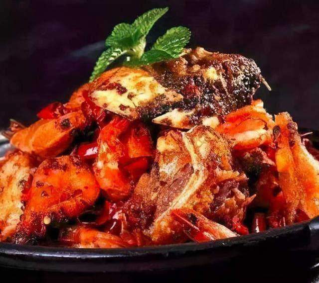 材料:鱼头300 克,基围虾200 克,大蒜50 克,干锅酱50克,干辣椒节20 克,花椒5 克盐、料酒、味精、干生粉、青花椒油、红油、菜油各适量 。