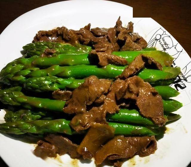 材料:芦笋、牛肉、油、黑椒汁、盐、生粉、料酒、蒜末