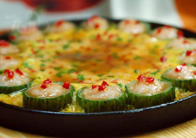 4、将肉丸放在切好的黄瓜段内,入蒸锅蒸3分钟;