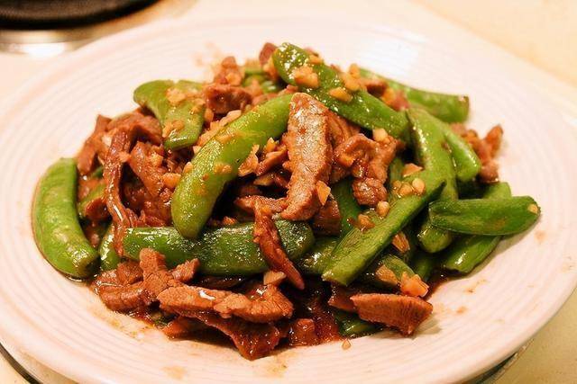 材料:甜豆500g、牛柳100g、蒜蓉若干、干椒碎少许、蚝油、生抽、淀粉、油。