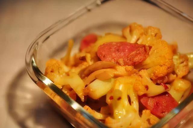 有机花菜;香肠片;杏鲍菇;老干妈