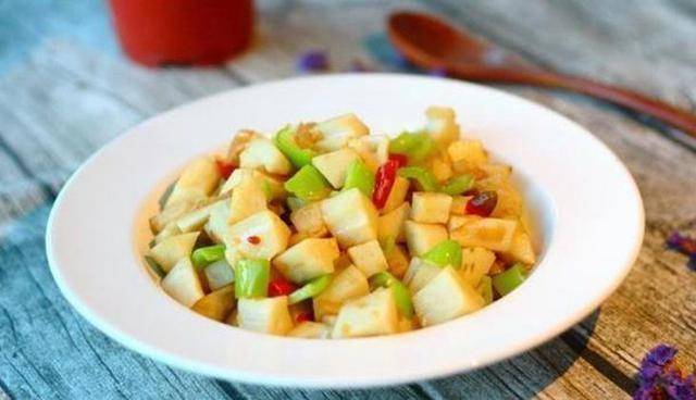 4、翻炒至莲藕丁表面变色时加入香醋快速翻炒均匀,加入青椒和盐,炒入味后关火出锅食用;