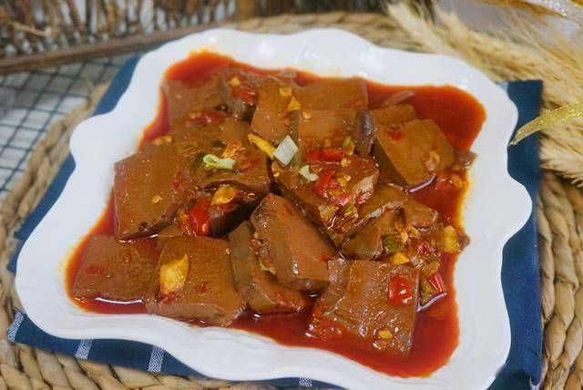 材料:猪血300克,豆瓣酱3勺,葱姜蒜适量