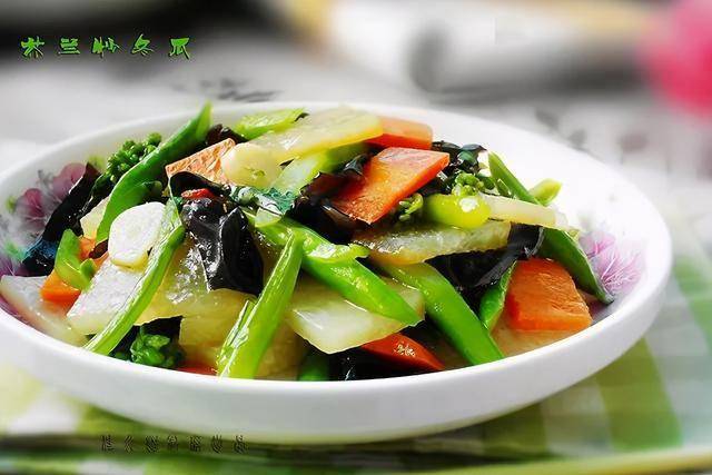 芥蓝200克,冬瓜200克,胡萝卜30克,木耳3朵,姜、盐、油、蔬果粉、水淀粉适量