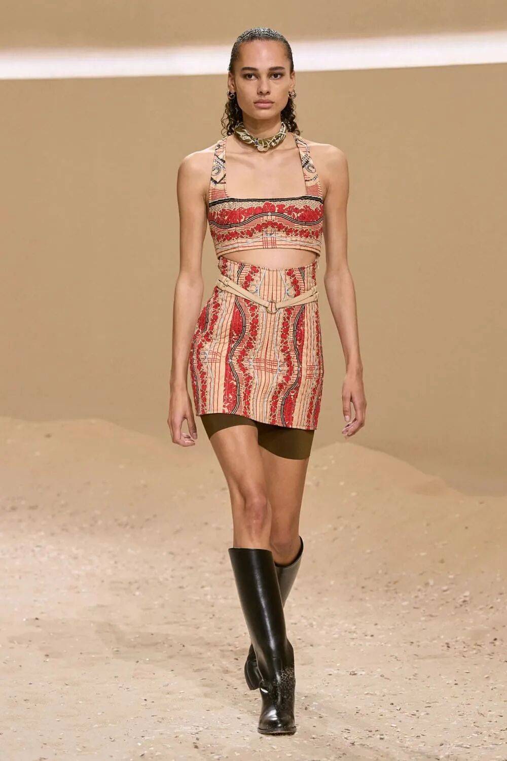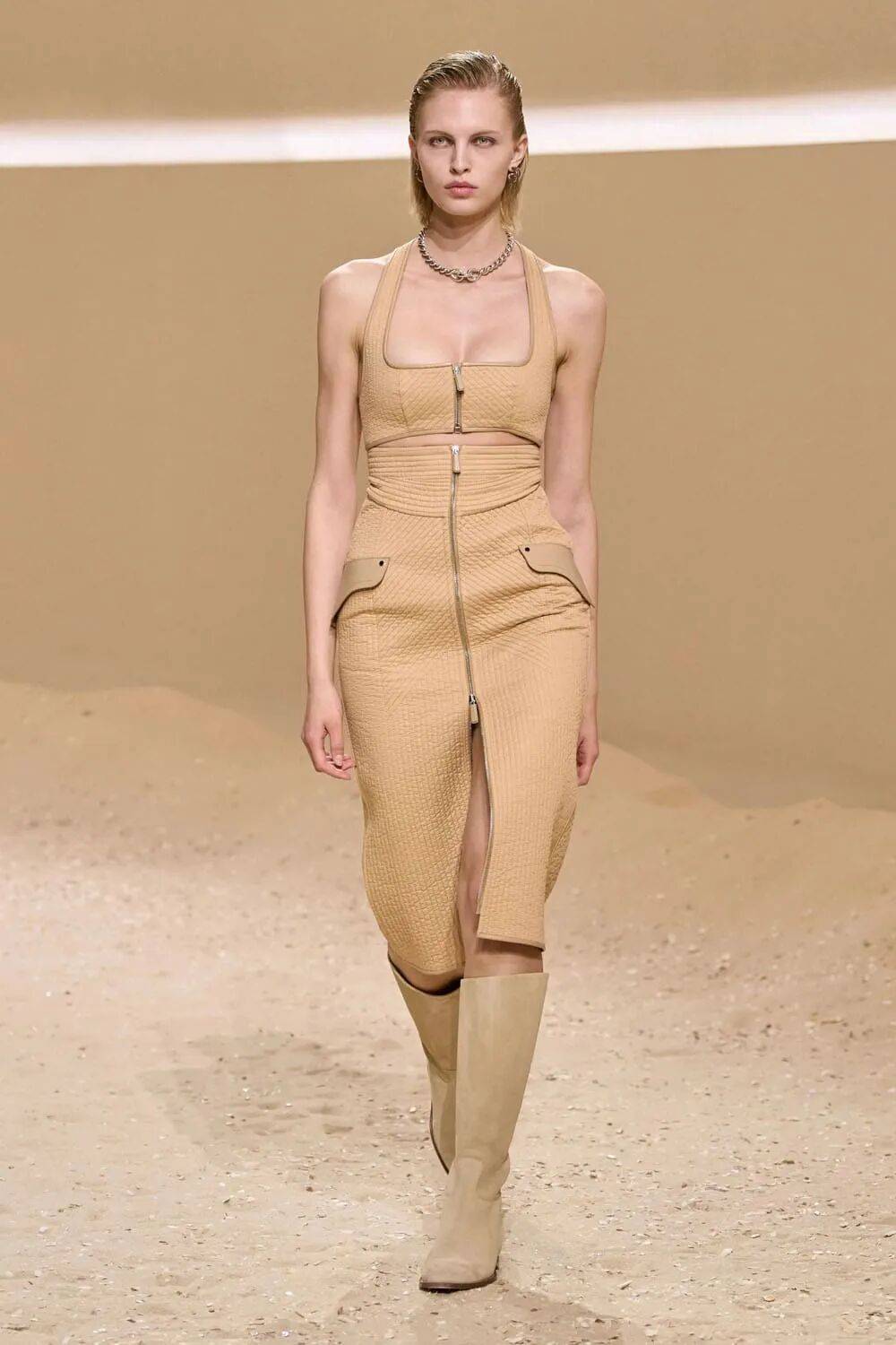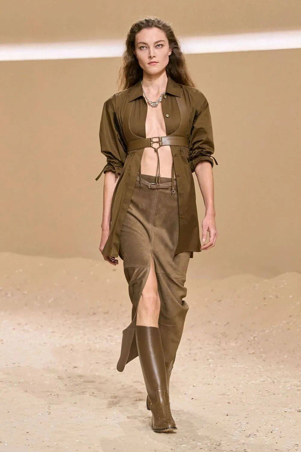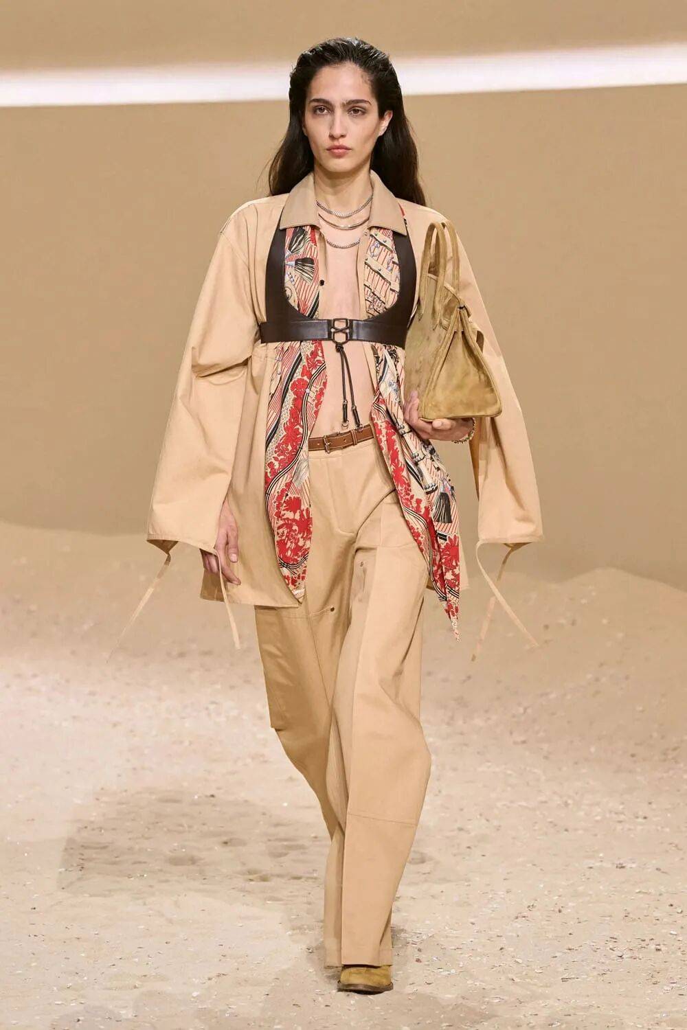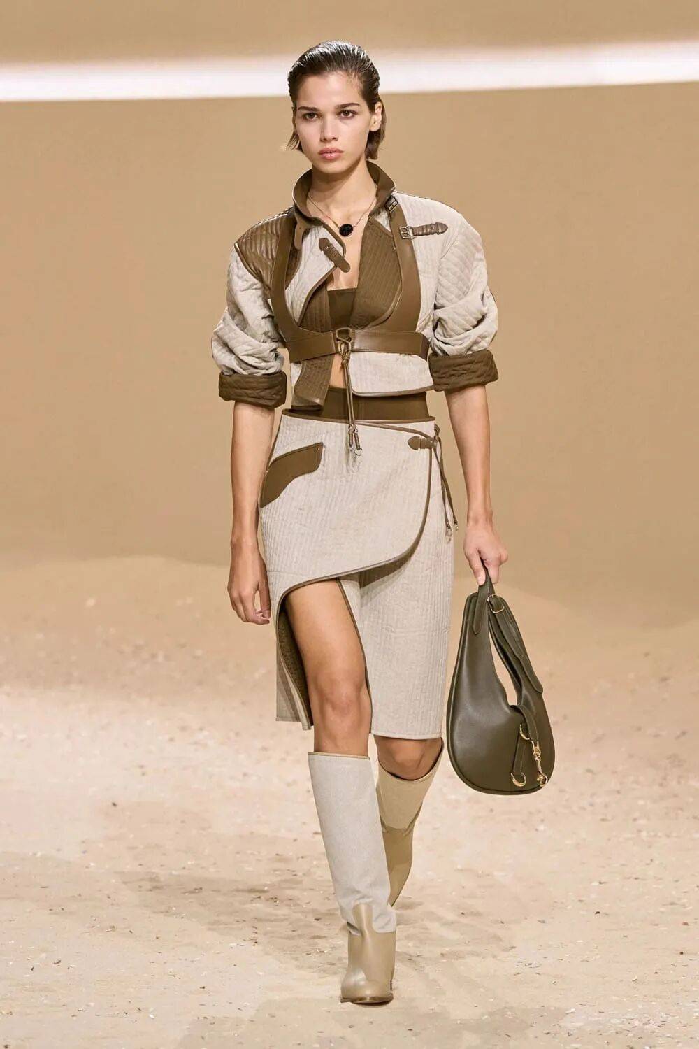 包袋挂钩化为胸衣骨架,马术缰绳编织成镂空背心,将功能性工具升华为身体装饰,诠释“力量型性感”。