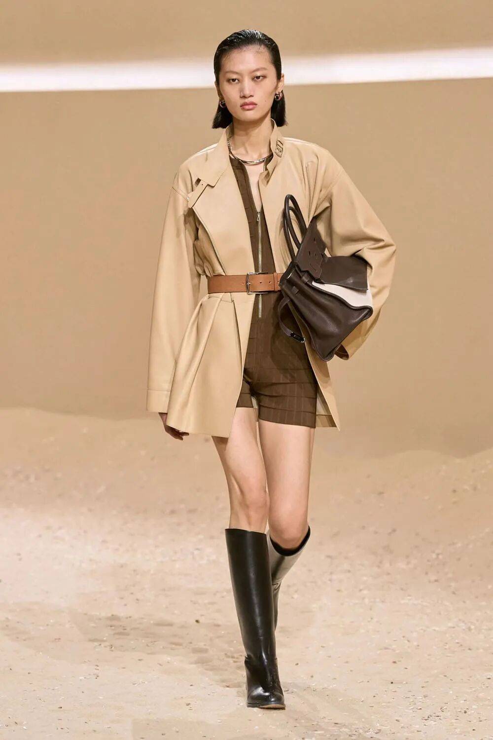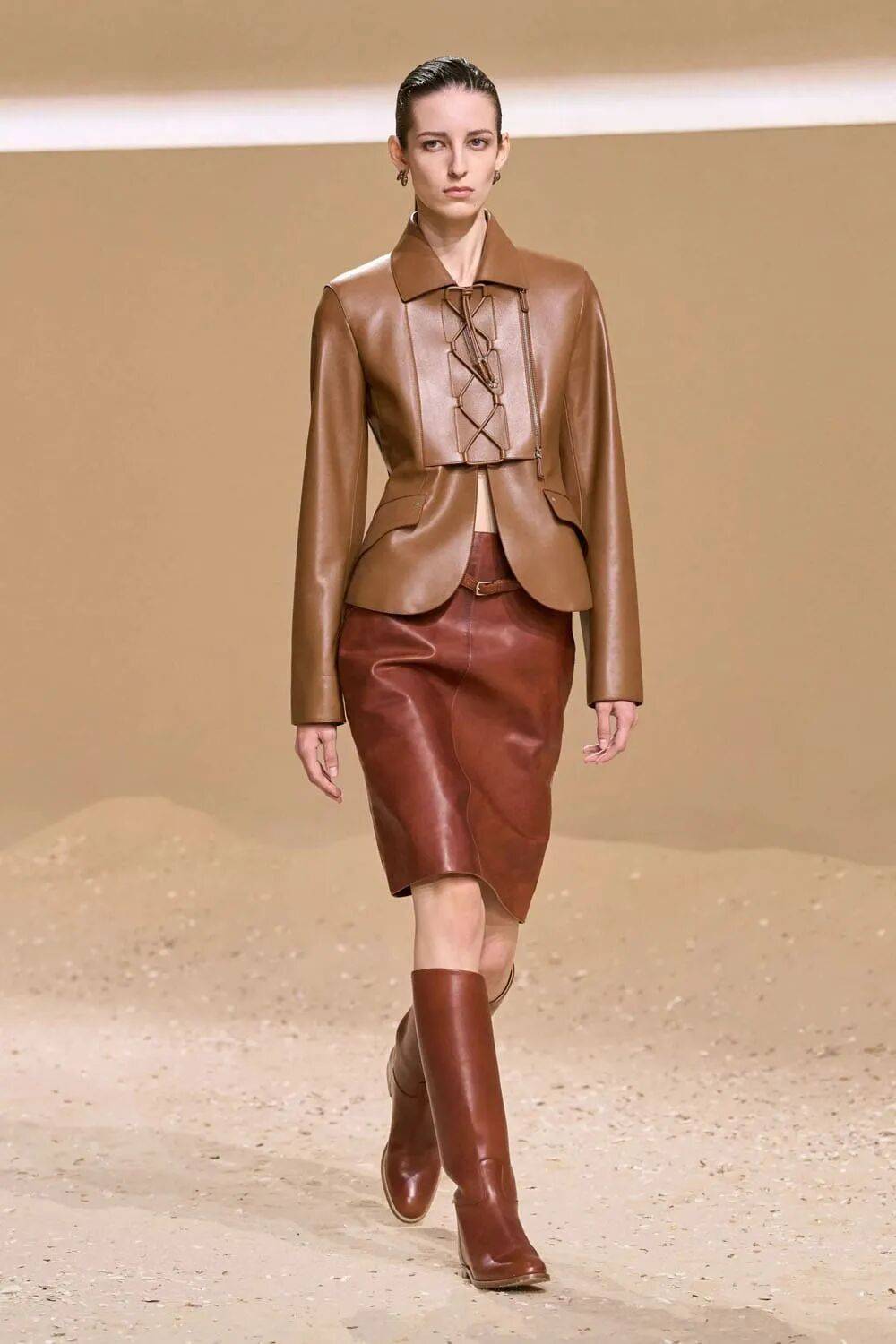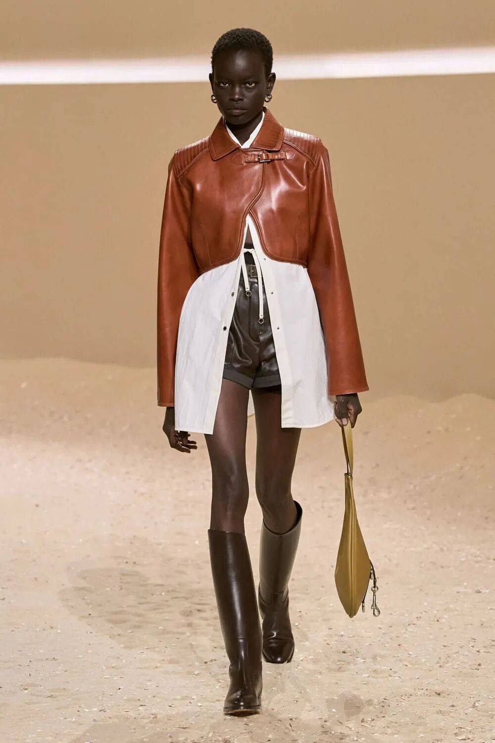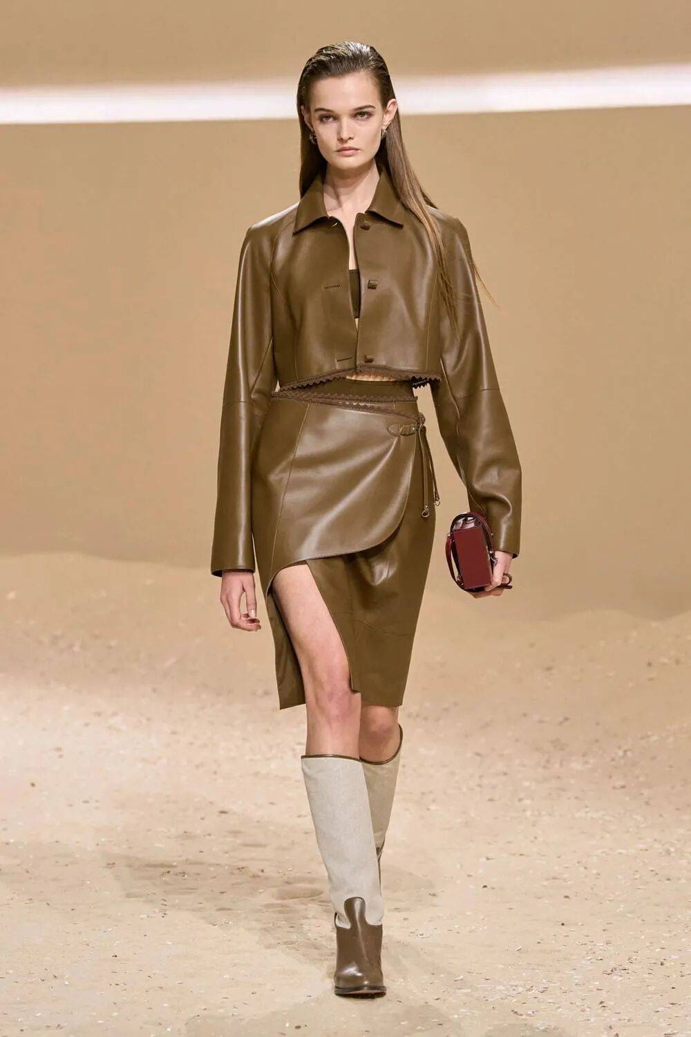 流体化处理:小牛皮经特殊鞣制后呈现瀑布般垂坠感,打破皮革的厚重印象,用于阔腿裤或裹身裙,呼应“飒”的流动线条。