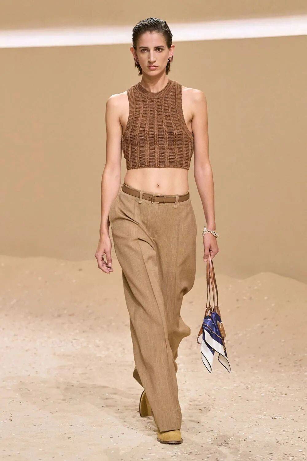 立体剪裁:90×90cm经典丝巾被拆解为不对称上衣的拼片,几何图案在身体转折处形成视觉错位,比Balenciaga的街头解构更显建筑感。
