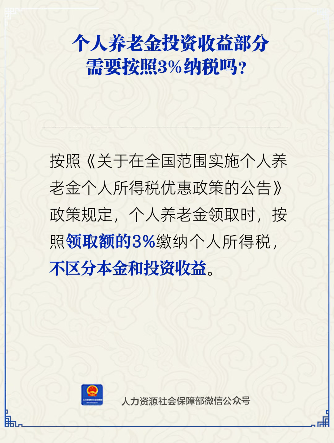 根据人社部消息明确,个人养老金领取时,按照领取额的3%缴纳个人所得税,不区分本金和投资收益。