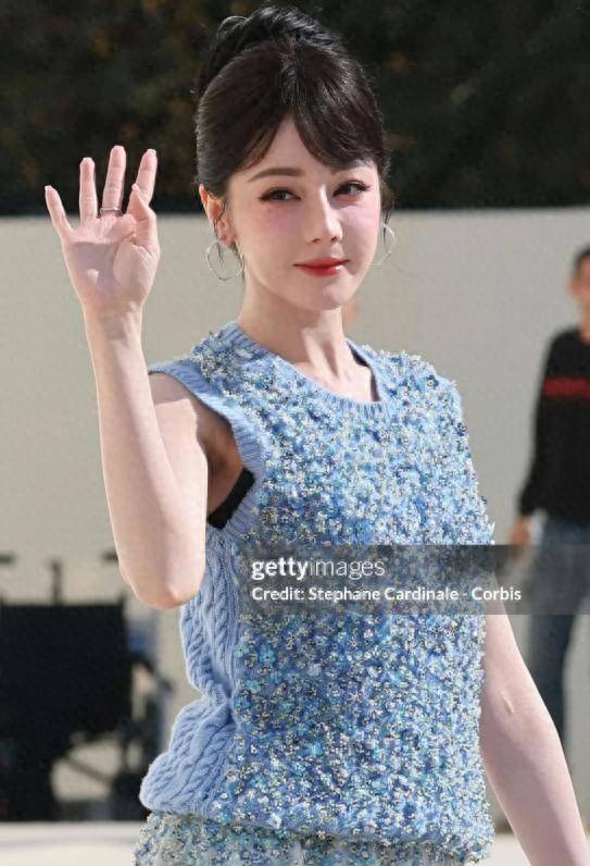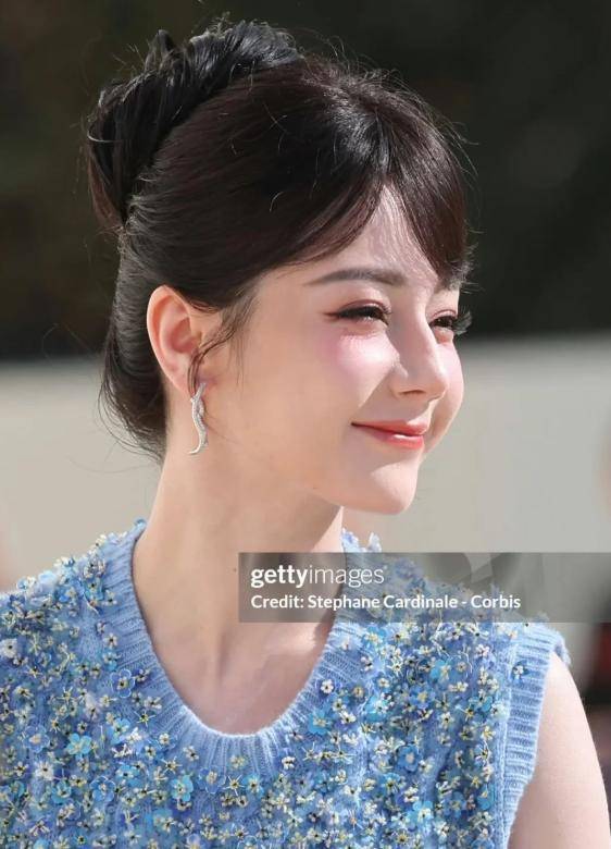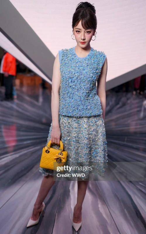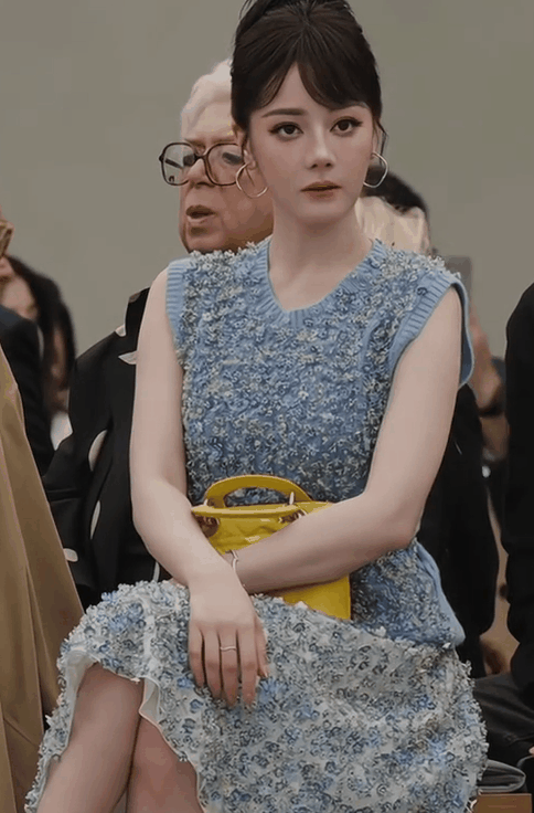 -   造型解析:迪丽热巴身着淡蓝色无袖花朵套裙,乍看之下光泽感十足,但细看之下却显得老气横秋。古早斜分刘海搭配高颅顶盘发,非但未能凸显高级感,反而让整体造型带有一丝土气。亮黄色手包与整体蓝调造型格格不入,色彩搭配失衡。更令人印象深刻的是,在秀场期间,她右脚细高跟鞋跟突然断裂,虽然后续凭借超强的职业素养化解了尴尬,但这无疑为本次造型添上了不完美的注脚。
