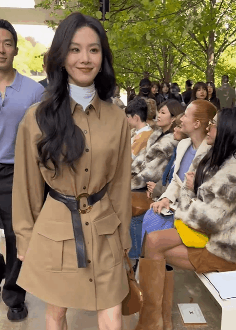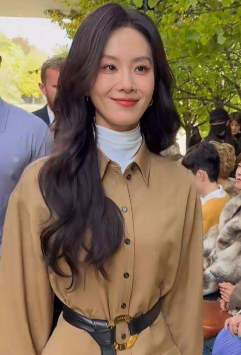 刘诗诗在CELINE ÉTÉ 2026夏季时装秀上的造型则展现了截然不同的知性美。她身着卡其色工装风连衣裙搭配高领白色打底,完美适配初秋氛围。水波纹长发温柔典雅,腰间的皮带巧妙勾勒出纤细身材曲线。