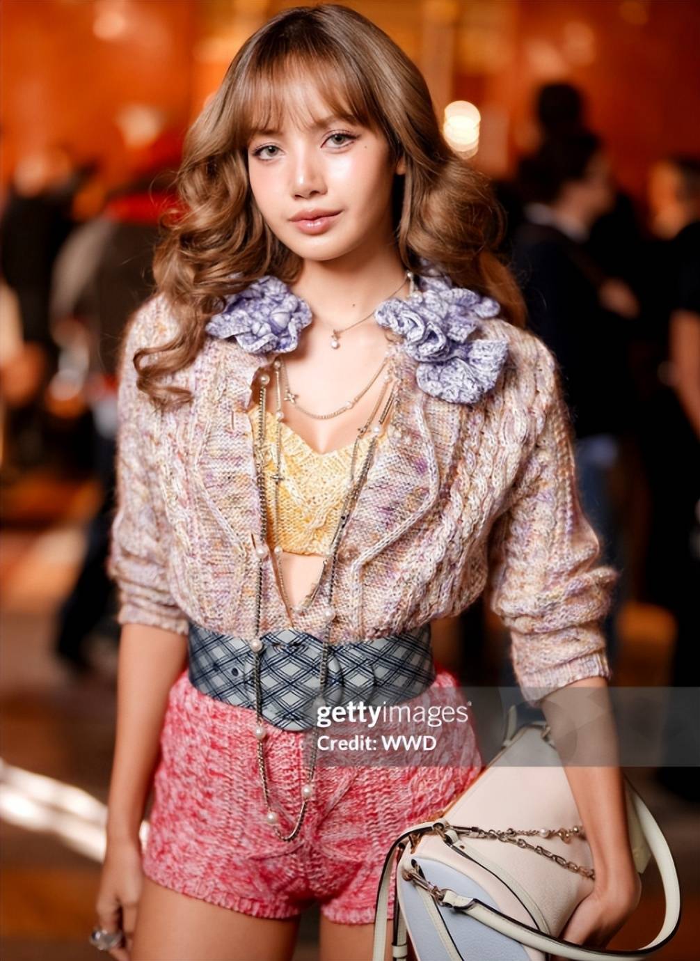 身穿马卡龙色系套装搭配长卷发,金色背心展现出若隐若现的事业线。
