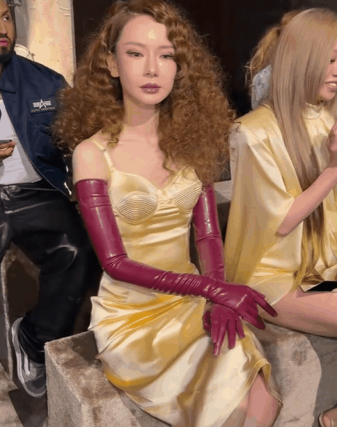 相较于迪丽热巴的小幅争议,戚薇在Mugler品牌秀场的造型堪称“灾难级”。这身香槟色螺纹吊带长裙皱皱巴巴,质感廉价;艳红色皮质手套不仅风格突兀,还将原本纤细的大臂勒出一圈“赘肉”,显得臃肿不堪。蓬松粗糙的羊毛卷发型搭配烟熏眼妆,让整体造型显得混乱且缺乏美感。