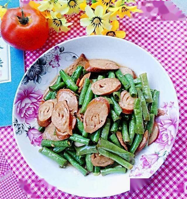 1.素鸡洗净切片,豆角去老筋洗干净切小段,生姜洗干净切片,大蒜洗净切碎