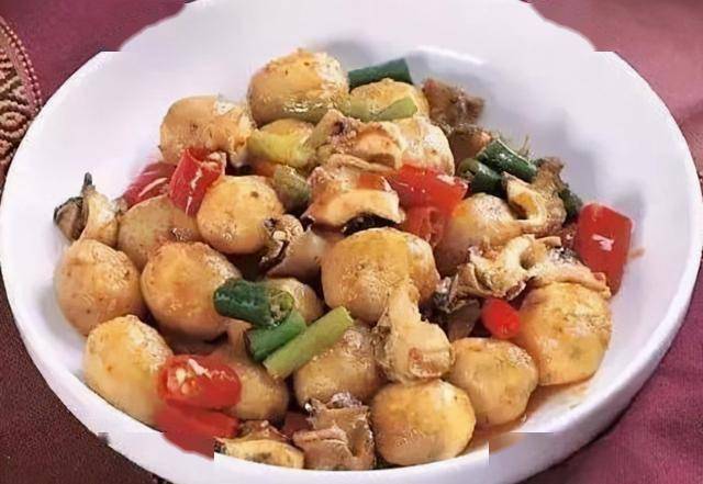 1. 小土豆爆炒海螺头:小土豆炸至金黄与海螺头同炒,加入豆瓣酱和甜面酱调味,鲜香微辣,是沿海地区的特色风味。
