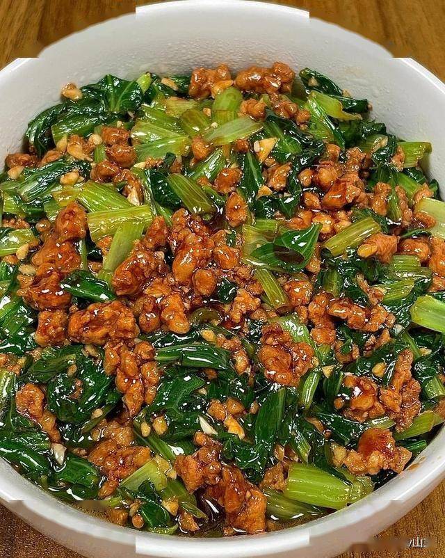 特点:肉末鲜香,油菜翠绿,荤素搭配合理,蛋白质与维生素互补。