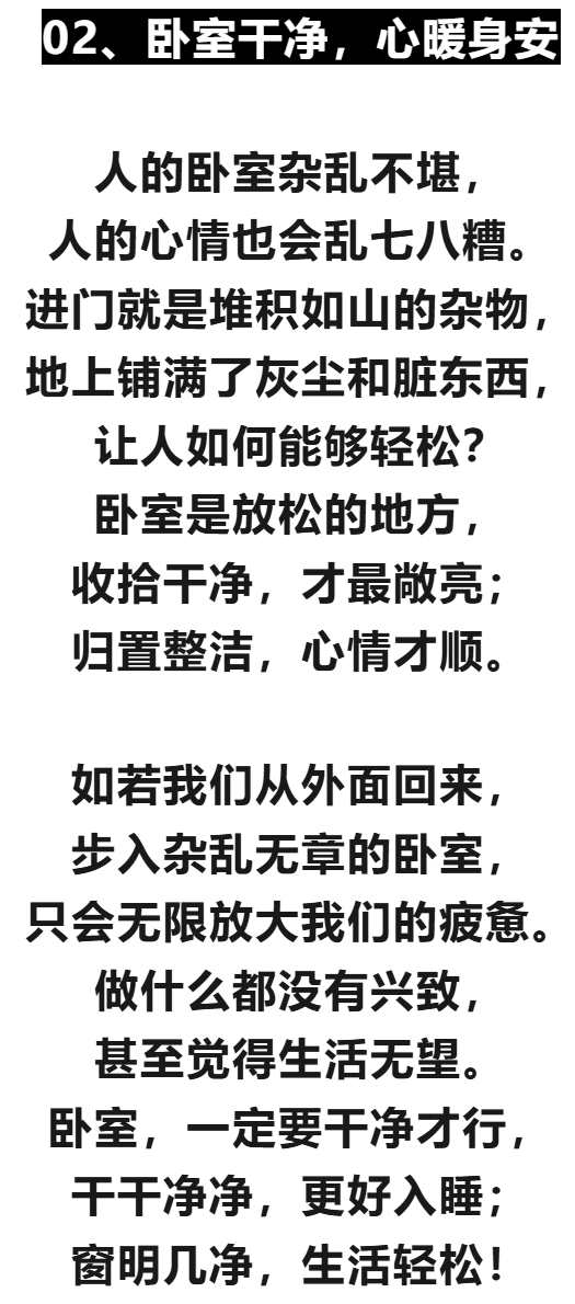 2.  情绪稳定的基石:“卧室净,则心安。”一个杂乱无章的卧室会让人内心焦躁不安。相反,整齐有序、一尘不染的卧室能让人内心平静,思绪清晰,有助于缓解压力和焦虑。