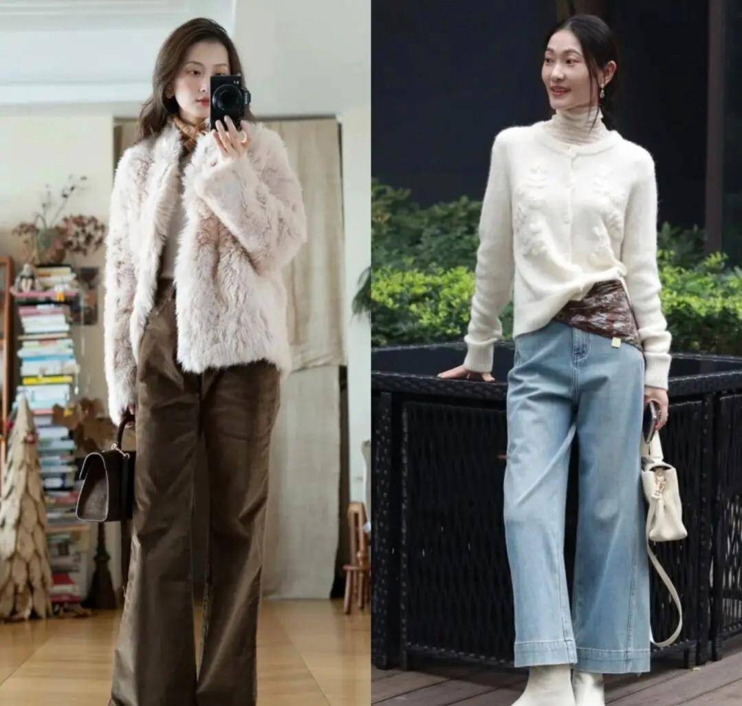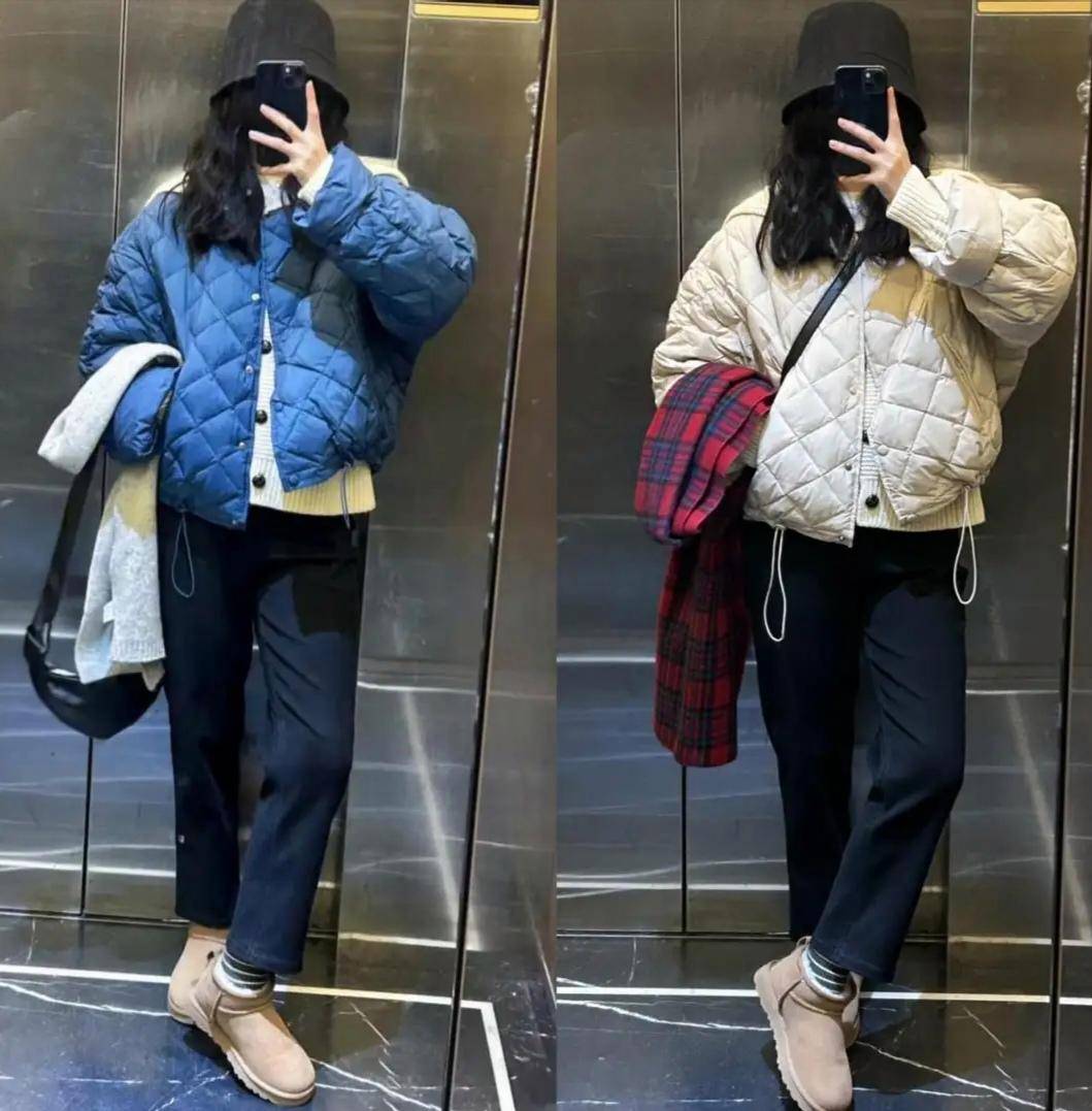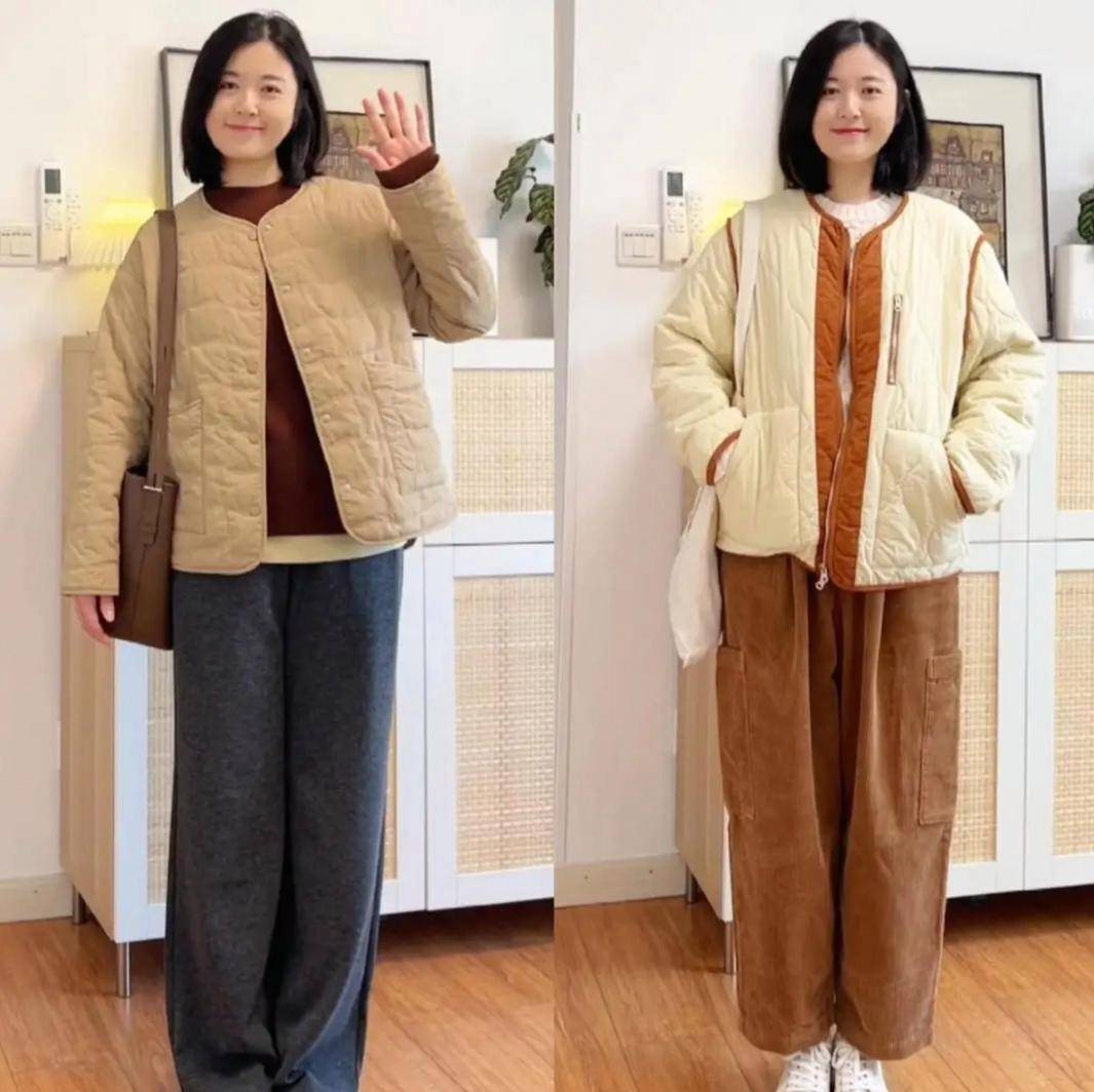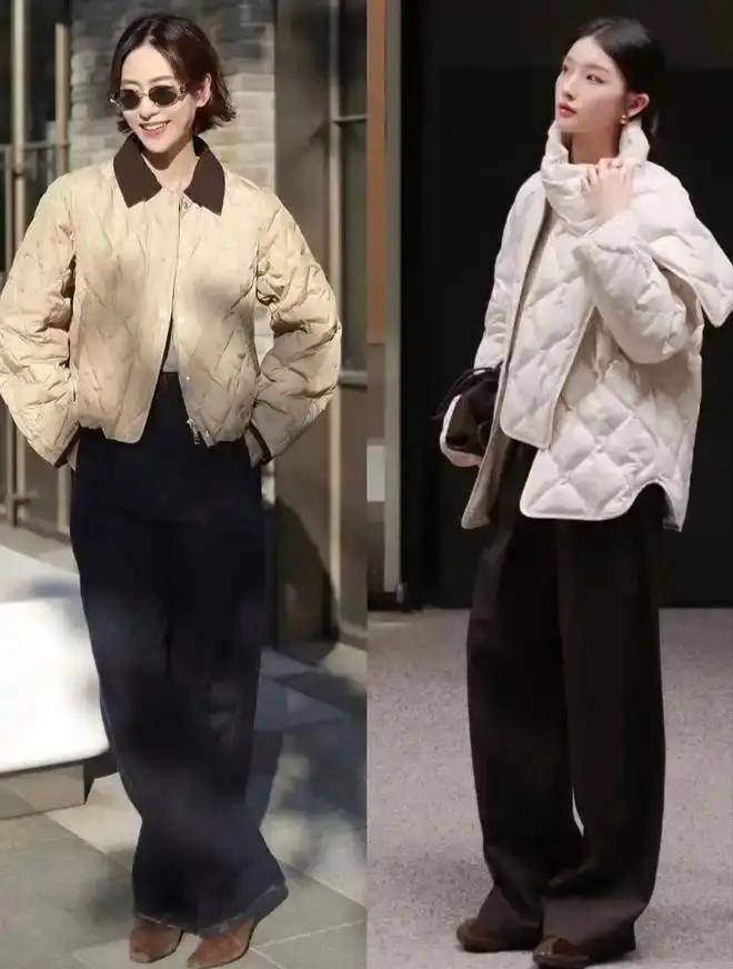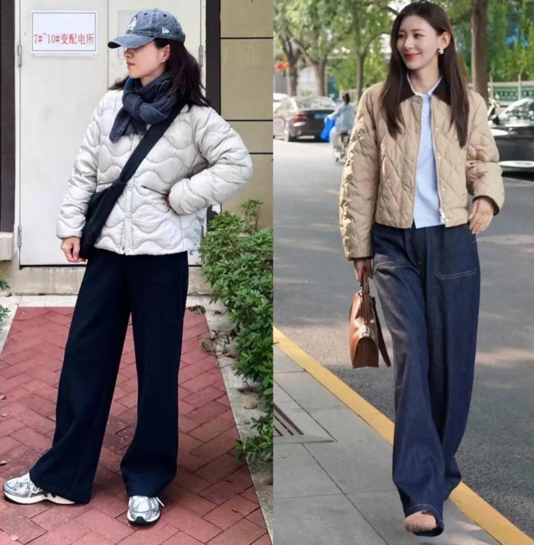 遮肉组合:奶奶棉服+阔腿牛仔裤/垂感西装裤(宽松裤型藏肉,材质碰撞增加层次)。