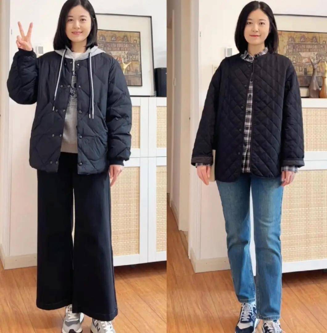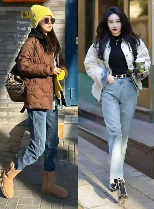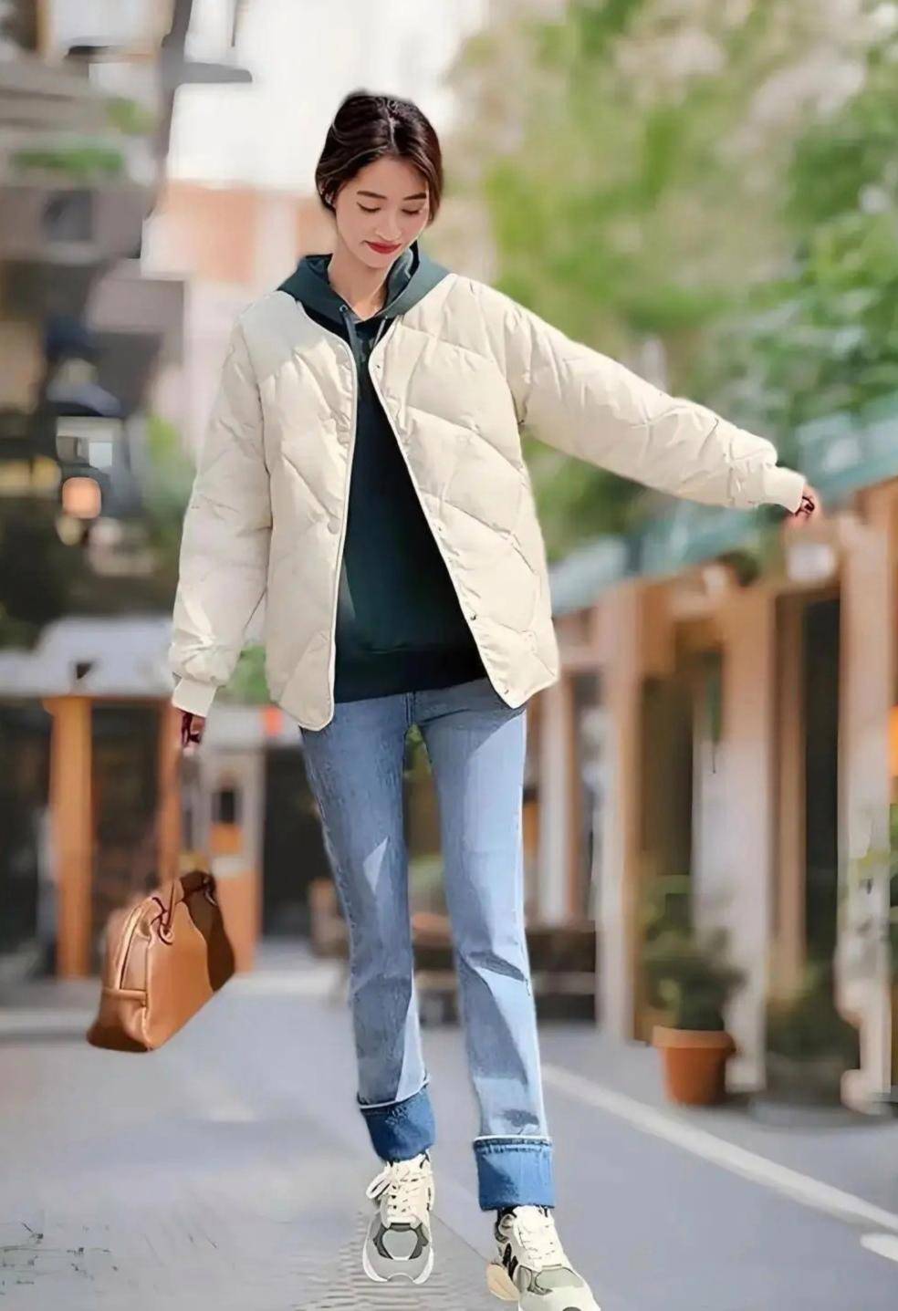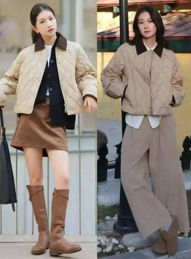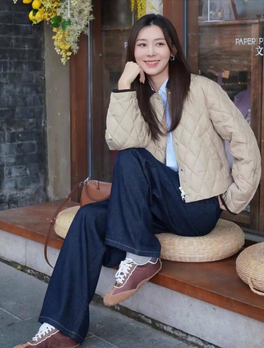 遮肉组合:奶奶棉服+阔腿牛仔裤/垂感西装裤(宽松裤型藏肉,材质碰撞增加层次)。