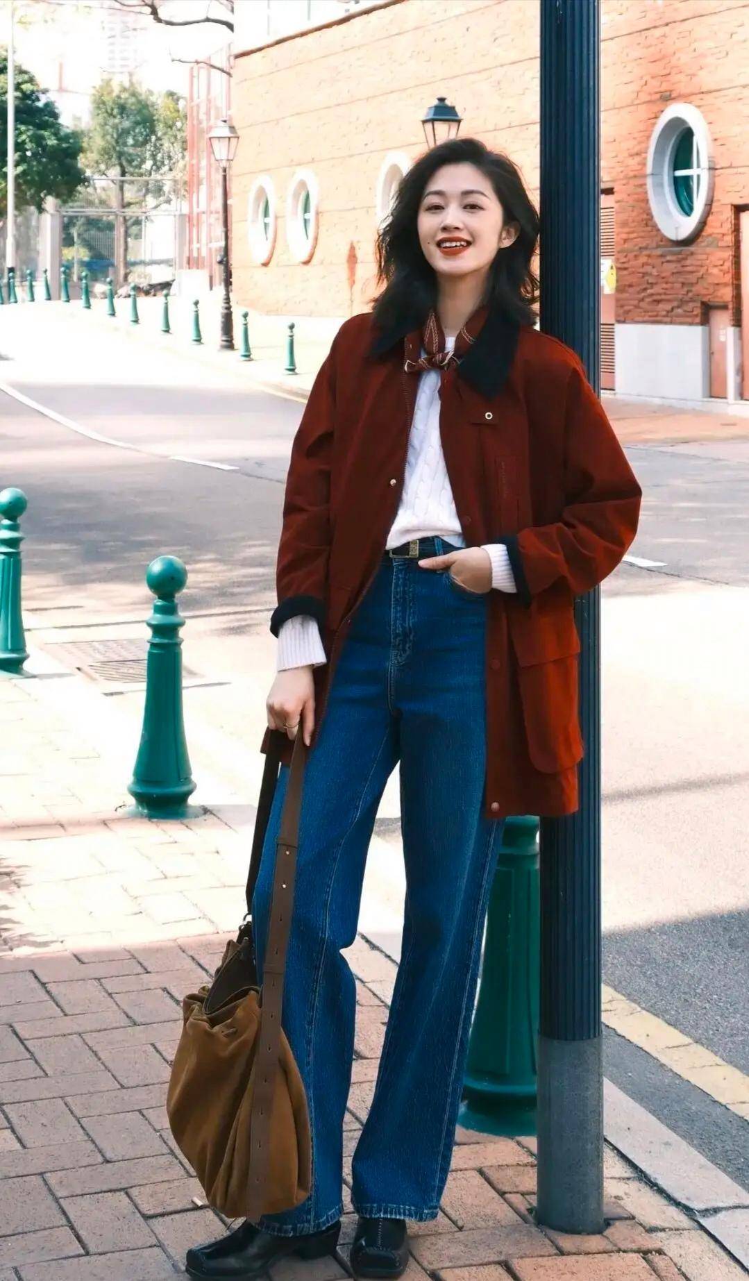 点睛色提亮:用酒红围巾、金属配饰或亮色内搭(占全身10%-20%)打破沉闷。