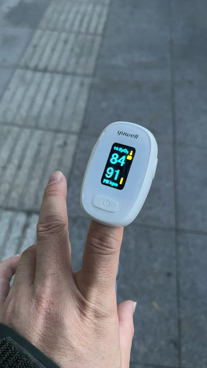 落地测了一下血氧,84,实际上可以通过更改呼吸的节奏来调整,多做深呼吸,加快呼吸的频率,都能有效提升。血氧降到80以下人就很不舒服了,嘴唇和手指甲也会变色,70以下就要吸氧。