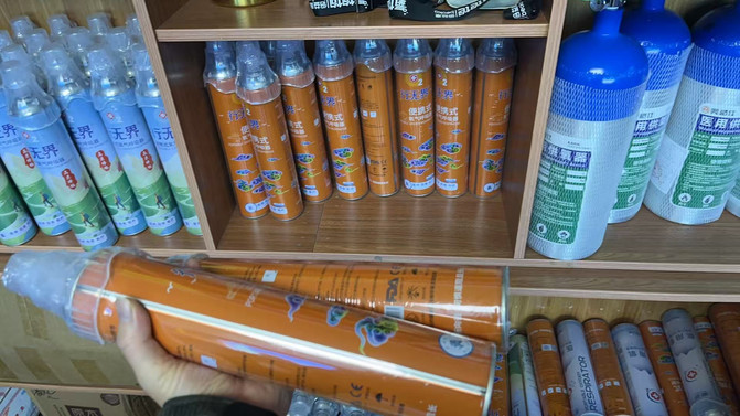 街上随处都有氧气点,可以根据自己的情况来购买便携式、碳纤维、充氧宝、枕头或是制氧机,我下车以后买了四瓶这种,一瓶可以用4-5分钟,最后翻垭口的时候用完了。