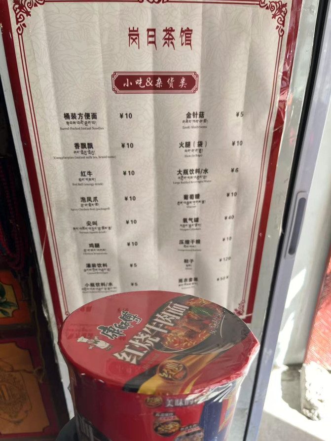 拉萨作为省会,饭店很多,选择面也广。但往西从日喀则开始,饮食条件就逐渐变差。县城还好些,镇上就不会太多了,转山的各个补给点更是基本只有藏餐。对于吃不惯藏餐的人来说,方便面成了最佳选择。最起码方便面一是能吃饱,二是吃不坏肚子。在转山途中,补给点的食物种类有限,想要吃得很好比较困难,所以提前做好饮食准备是很必要的。