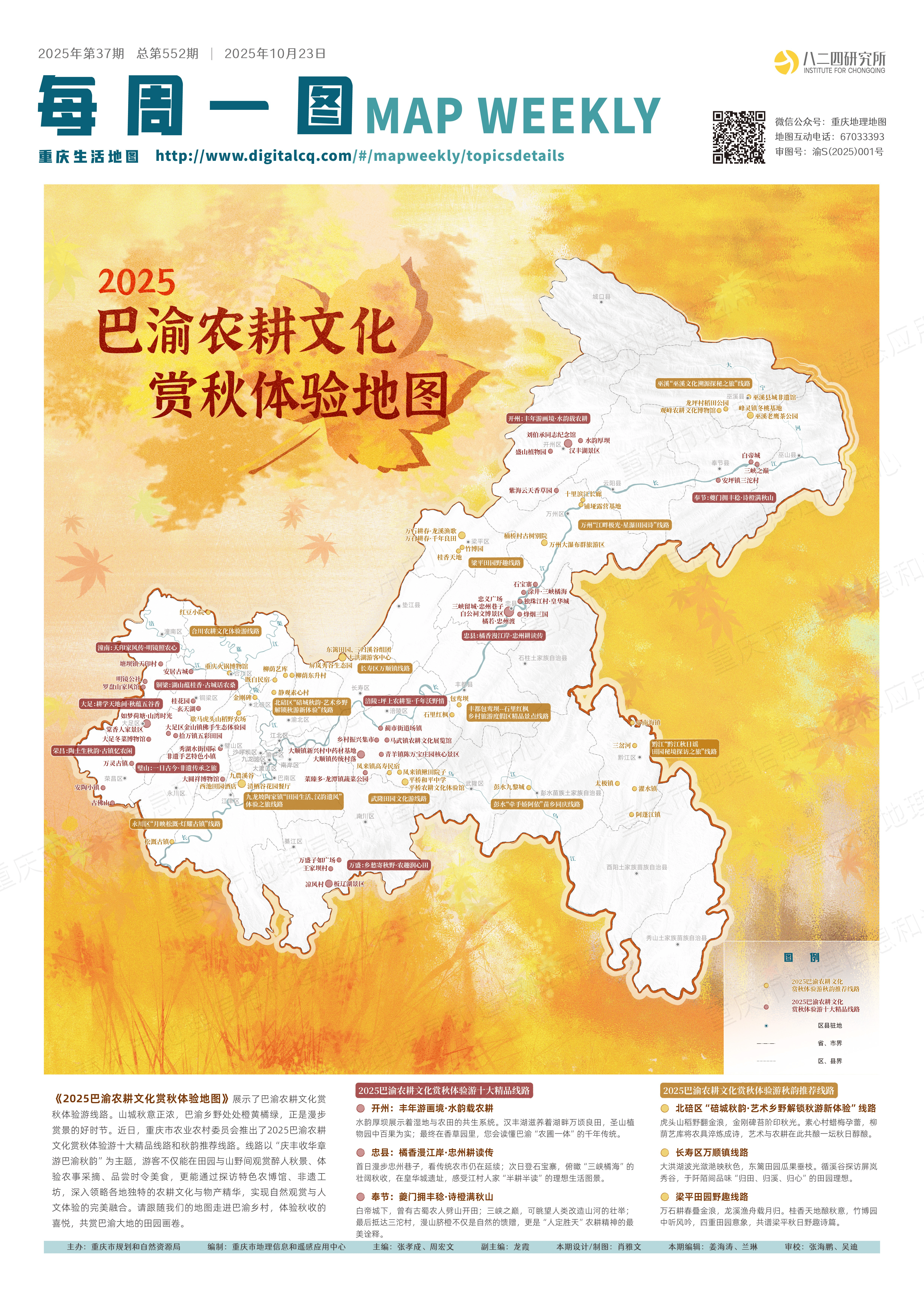 山城秋意正浓,巴渝乡野处处橙黄橘绿,正是漫步赏景的好时节。日前,重庆市地理信息和遥感应用中心推出《2025巴渝农耕文化赏秋体验地图》,方便市民和游客走进巴渝乡村,赏秋日画卷。