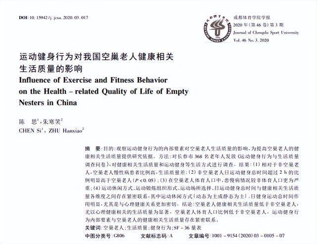 [1]陈思,朱寒笑.运动健身行为对我国空巢老人健康相关生活质量的影响[J].成都体育学院学报,2020,