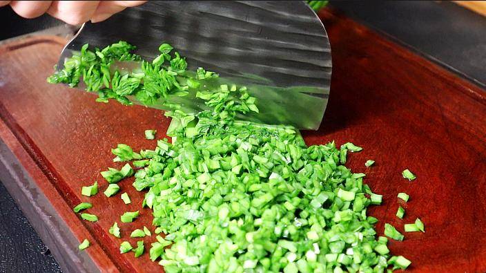 2、韭菜一定要选这种嫩一点的韭菜,顶刀切成粒儿,然后盛到盆里。