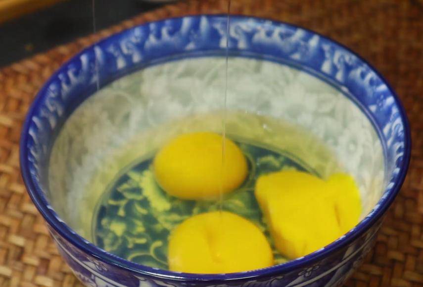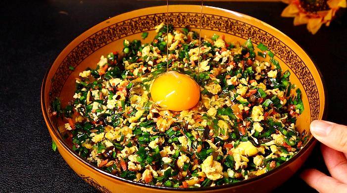 5、最后一个重点就是包之前一定要往馅里打一个生鸡蛋,这个方法就是韭菜吃着不烧心的关键。
