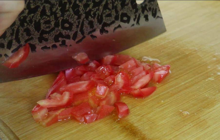 1、首先准备西红柿不用去皮,把根部切掉,,然后再把它切成大块,再准备一个西红柿将它切成小丁备用。