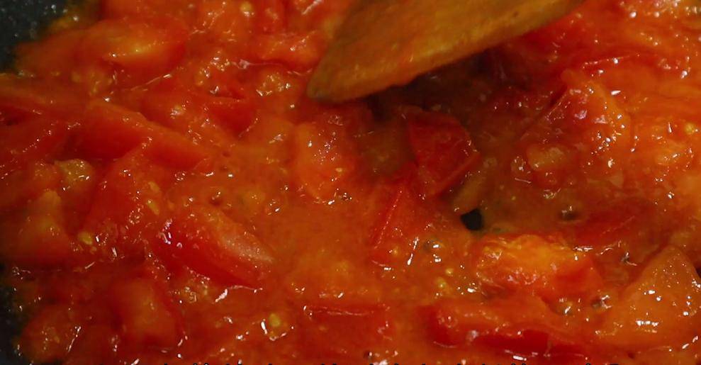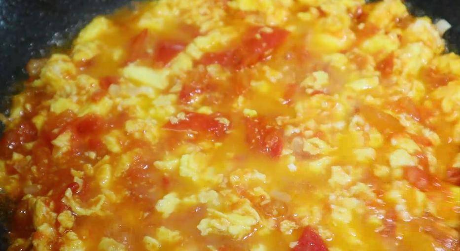 4、不用洗锅,直接倒入西红柿块翻炒,加少盐,西红柿更容易出汁,大火不断翻炒,可以用铲子压一压,,把西红柿炒碎,炒到汁水浓稠就可以了。
