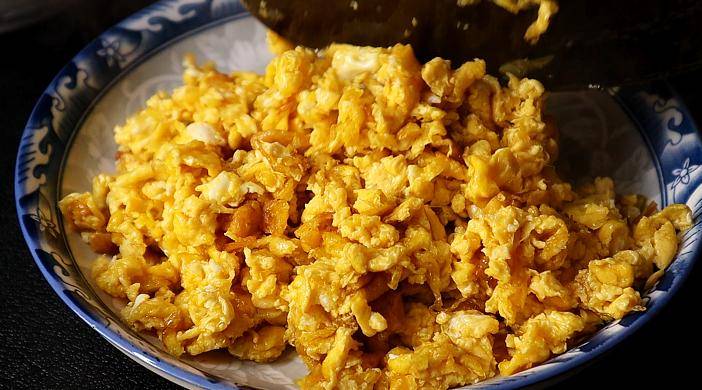 1、首先碗里打几个鸡蛋,盐味一次性加够,然后我这样打散,油温六成热时,倒入鸡蛋液。像我这样给它炒熟炒散,然后盛出来备用。